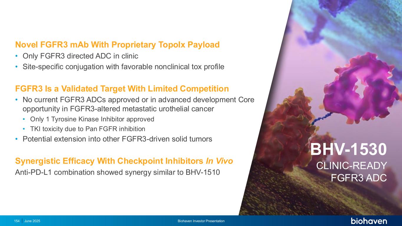 具有专有TopoIX有效载荷的新型FGFR3 MAB •临床上仅有FGFR3定向ADC •具有有利的非临床tox谱的位点特异性偶联FGFR3是一个经过验证的靶点,竞争有限•目前没有FGFR3 ADC被批准或处于FGFR3改变的转移性尿路上皮癌的先进开发核心机会•仅有1种酪氨酸激酶抑制剂被批准•泛FGFR抑制引起的TKI毒性•潜在扩展到其他FGFR3驱动的实体瘤与检查点抑制剂的协同疗效在体内抗PD-L1组合显示出类似于BHV-1510的协同作用2025年6月Biohaven投资者介绍154 BHV-1530 CLINIC-READY FGFR3 ADC