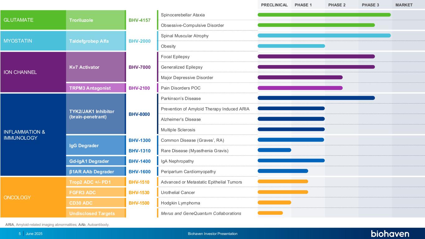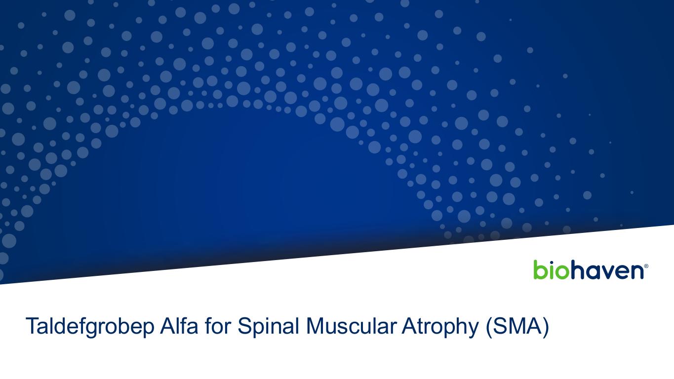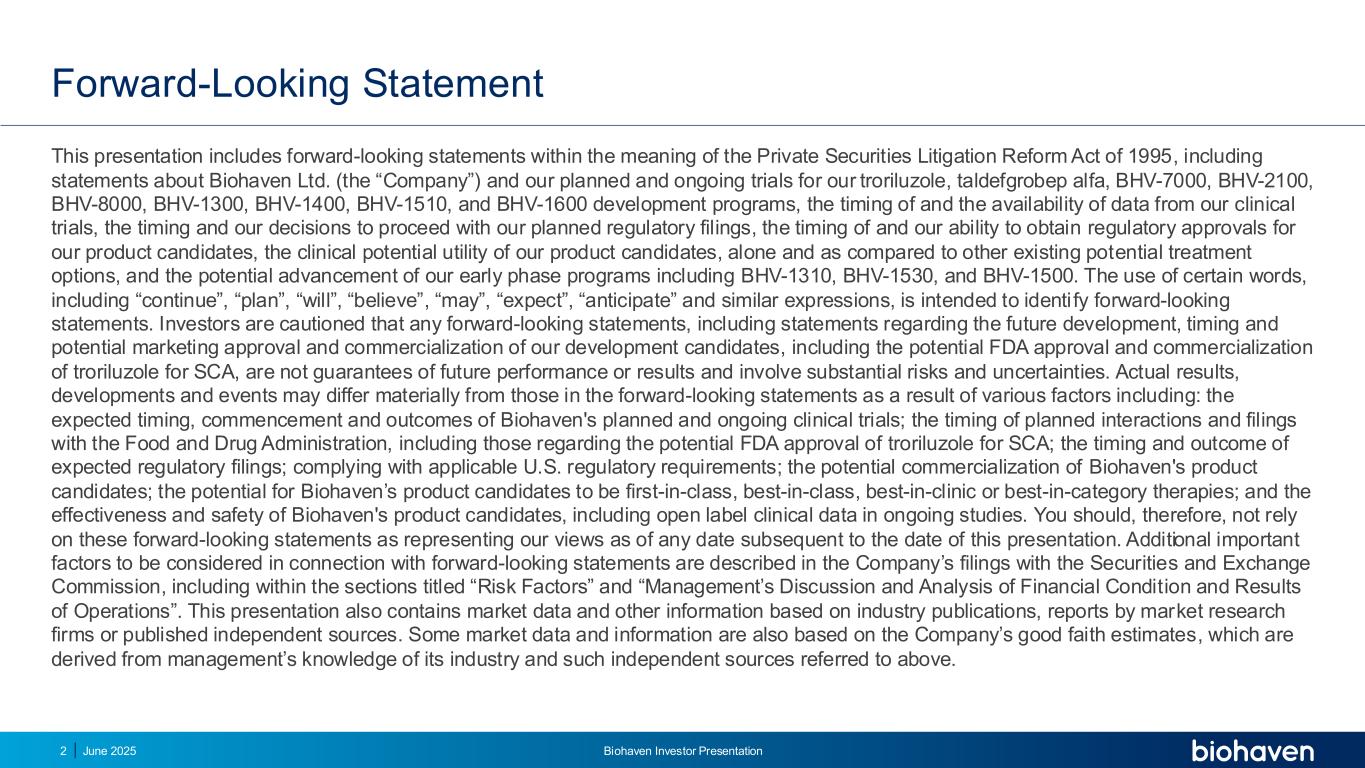 前瞻性陈述本演示文稿包括1995年《私人证券诉讼改革法案》含义内的前瞻性陈述,包括关于Biohaven Ltd.(“公司”)的陈述以及我们针对曲鲁唑、taldefgrobep alfa、BHV-7000、BHV-2100、BHV-8000、BHV-1300、BHV-1400、BHV-1510和BHV-1600开发计划的计划和正在进行的试验、我们临床试验数据的时间安排和可用性、进行计划的监管备案的时间安排和我们的决定、获得监管批准的时间安排和我们的能力我们的产品候选者、我们的产品候选者的临床潜在效用,单独和与其他现有的潜在治疗方案相比,以及我们早期阶段项目的潜在进展,包括BHV-1310、BHV-1530和BHV-1500。使用某些词语,包括“继续”、“计划”、“将”、“相信”、“可能”、“预期”、“预期”和类似的表达方式,旨在识别前瞻性陈述。请投资者注意,任何前瞻性陈述,包括关于我们的开发候选者的未来开发、时间安排和潜在营销批准和商业化的陈述,包括用于SCA的曲鲁唑的潜在FDA批准和商业化,都不是对未来业绩或结果的保证,并且涉及重大风险和不确定性。由于多种因素,实际结果、发展和事件可能与前瞻性陈述中的结果、发展和事件存在重大差异,这些因素包括:Biohaven计划和正在进行的临床试验的预期时间、开始和结果;计划与美国食品药品监督管理局进行互动和备案的时间安排,包括那些与FDA可能批准曲鲁唑用于SCA的时间安排;预期监管备案的时间安排和结果;符合适用的美国监管要求;Biohaven候选产品的潜在商业化;Biohaven候选产品成为一流、一流的潜力,临床最佳或类别最佳疗法;以及Biohaven候选产品的有效性和安全性,包括正在进行的研究中的开放标签临床数据。因此,您不应依赖这些前瞻性陈述来代表我们在本演示文稿日期之后的任何日期的观点。公司提交给美国证券交易委员会的文件中描述了与前瞻性陈述相关的其他需要考虑的重要因素,包括标题为“风险因素”和“管理层对财务状况和运营结果的讨论和分析”的章节。本演示文稿还包含基于行业出版物、市场研究公司报告或已发布的独立来源的市场数据和其他信息。一些市场数据和信息也基于公司的善意估计,这些估计来自管理层对其行业的了解以及上述这些独立来源。2025年6月Biohaven投资者说明会2