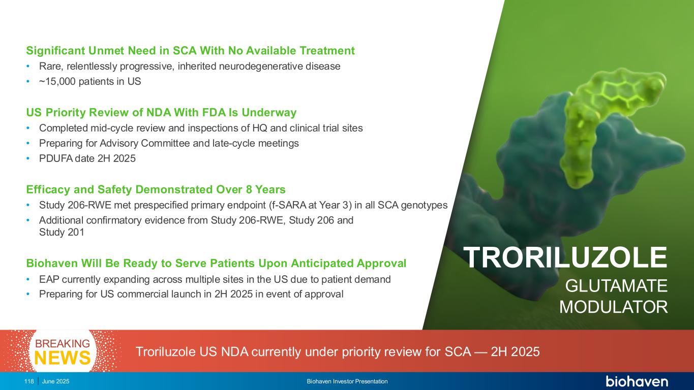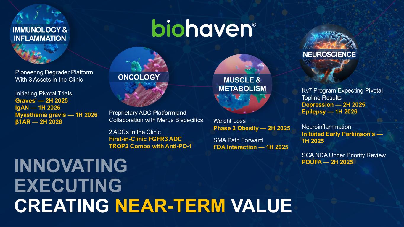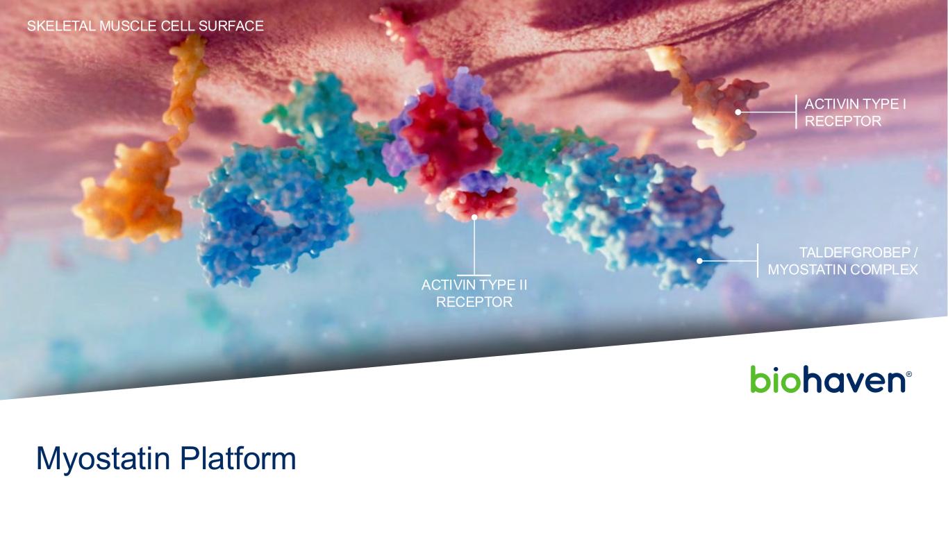 前瞻性陈述本演示文稿包括1995年《私人证券诉讼改革法案》含义内的前瞻性陈述,包括关于Biohaven Ltd.(“公司”)的陈述以及我们针对曲鲁唑、taldefgrobep alfa、BHV-7000、BHV-2100、BHV-8000、BHV-1300、BHV-1400、BHV-1510和BHV-1600开发计划的计划和正在进行的试验、我们临床试验数据的时间安排和可用性、进行计划的监管备案的时间安排和我们的决定、获得监管批准的时间安排和我们的能力我们的产品候选者、我们的产品候选者的临床潜在效用,单独和与其他现有的潜在治疗方案相比,以及我们早期阶段项目的潜在进展,包括BHV-1310、BHV-1530和BHV-1500。使用某些词语,包括“继续”、“计划”、“将”、“相信”、“可能”、“预期”、“预期”和类似的表达方式,旨在识别前瞻性陈述。请投资者注意,任何前瞻性陈述,包括关于我们的开发候选者的未来开发、时间安排和潜在营销批准和商业化的陈述,包括用于SCA的曲鲁唑的潜在FDA批准和商业化,都不是对未来业绩或结果的保证,并且涉及重大风险和不确定性。由于多种因素,实际结果、发展和事件可能与前瞻性陈述中的结果、发展和事件存在重大差异,这些因素包括:Biohaven计划和正在进行的临床试验的预期时间、开始和结果;计划与美国食品药品监督管理局进行互动和备案的时间安排,包括那些与FDA可能批准曲鲁唑用于SCA的时间安排;预期监管备案的时间安排和结果;符合适用的美国监管要求;Biohaven候选产品的潜在商业化;Biohaven候选产品成为一流、一流的潜力,临床最佳或类别最佳疗法;以及Biohaven候选产品的有效性和安全性,包括正在进行的研究中的开放标签临床数据。因此,您不应依赖这些前瞻性陈述来代表我们在本演示文稿日期之后的任何日期的观点。公司提交给美国证券交易委员会的文件中描述了与前瞻性陈述相关的其他需要考虑的重要因素,包括标题为“风险因素”和“管理层对财务状况和运营结果的讨论和分析”的章节。本演示文稿还包含基于行业出版物、市场研究公司报告或已发布的独立来源的市场数据和其他信息。一些市场数据和信息也基于公司的善意估计,这些估计来自管理层对其行业的了解以及上述这些独立来源。2025年6月Biohaven投资者说明会2