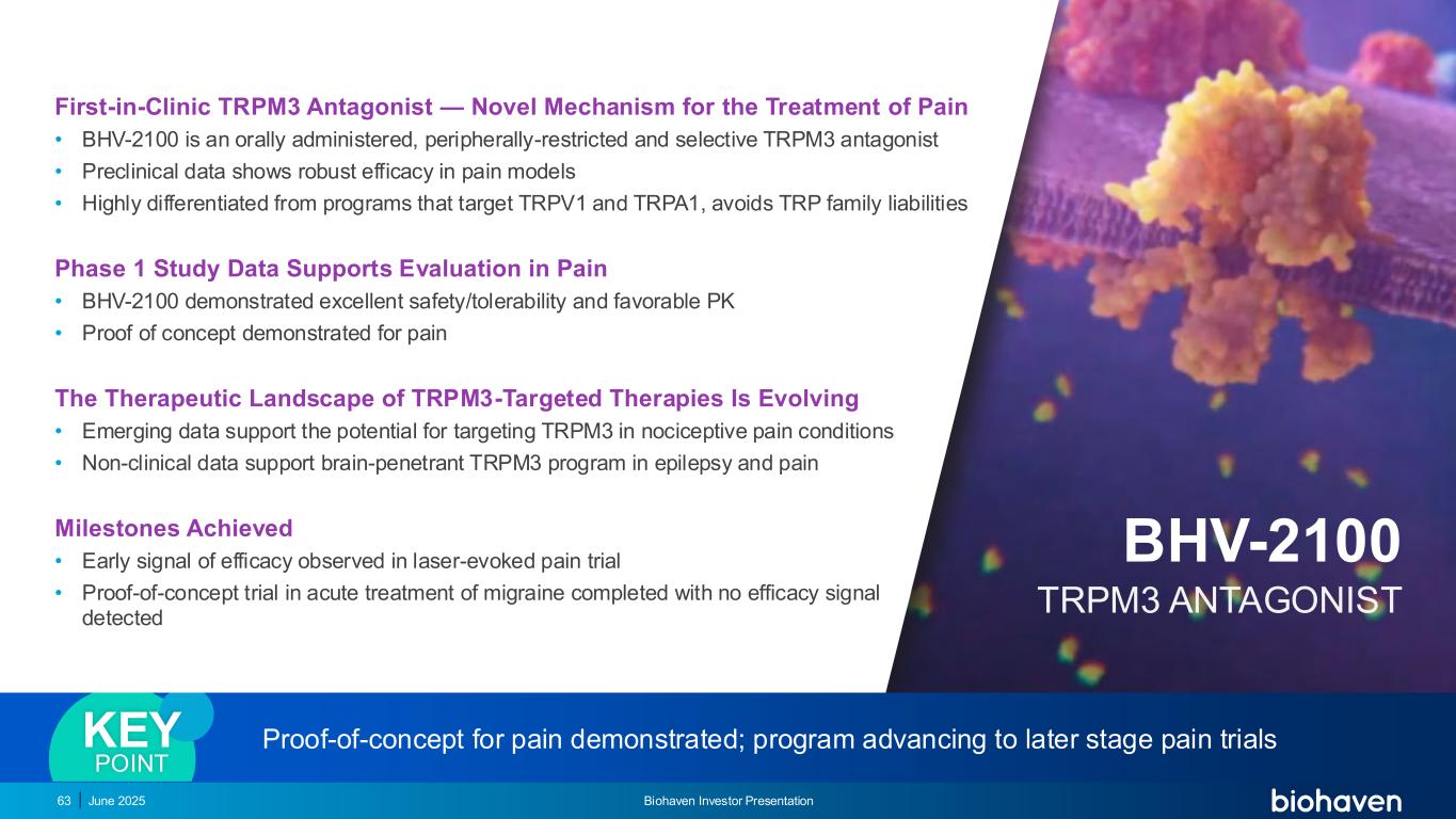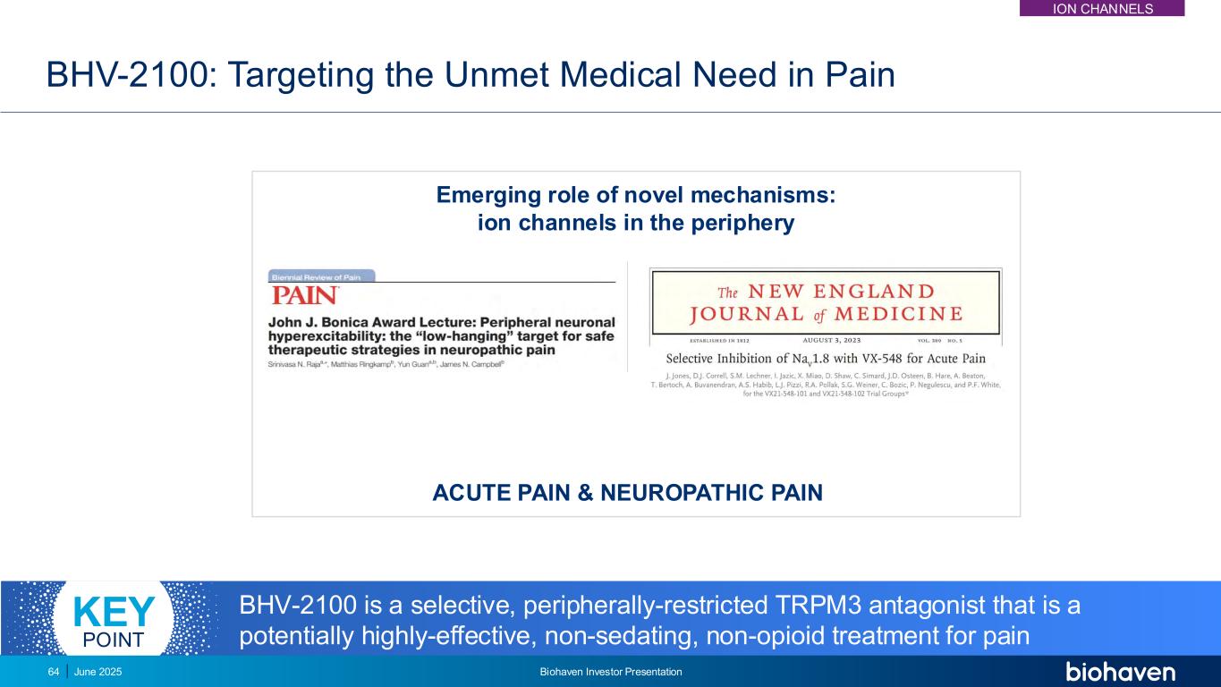 BHV-2100:靶向疼痛中未满足的医疗需求急性疼痛&神经性疼痛新机制的新兴作用:外周离子通道BHV-2100是一种选择性、外周限制性TRPM3拮抗剂,是一种潜在的高效、非镇静、非阿片类药物治疗疼痛的关键点ION Channels 2025年6月丨Biohaven投资者说明会64