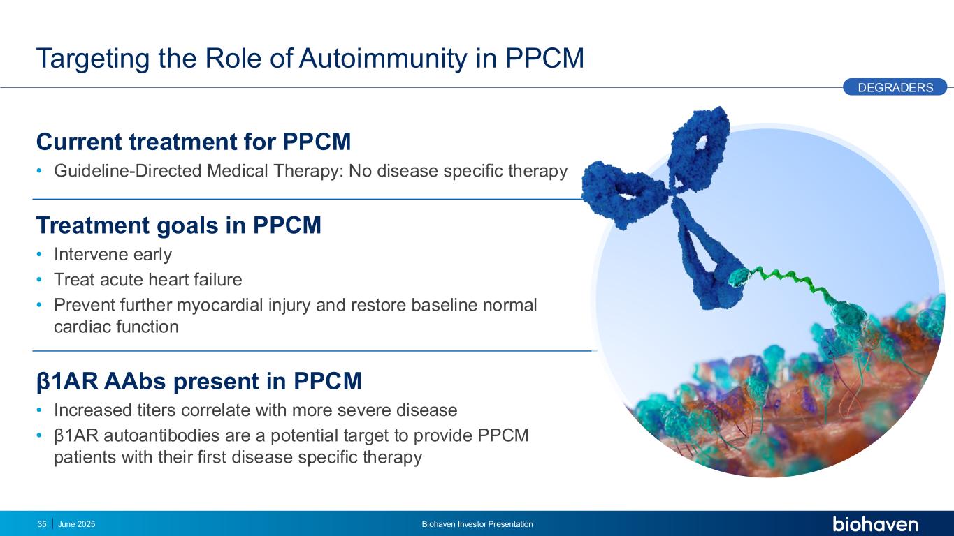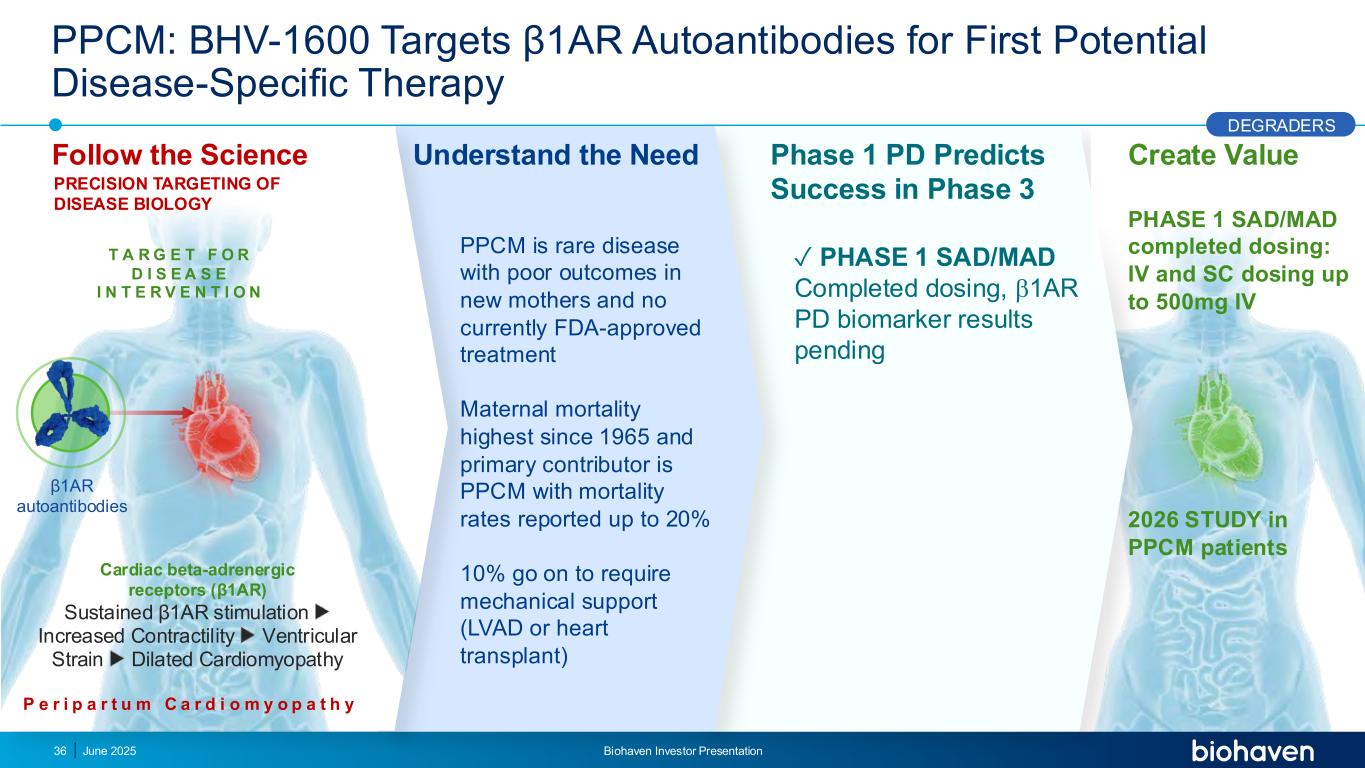 靶向自身免疫在PPCM中的作用目前PPCM的治疗•指南指导的医学治疗:PPCM中没有疾病特异性治疗的治疗目标•早期干预•治疗急性心力衰竭•防止进一步的心肌损伤并恢复PPCM中存在的基线正常心功能β 1AR AAB •增加的滴度与更严重的疾病相关• β 1AR自身抗体是为PPCM患者提供其首次疾病特异性治疗的潜在靶点35 DEGRADERS 2025年6月Biohaven投资者介绍