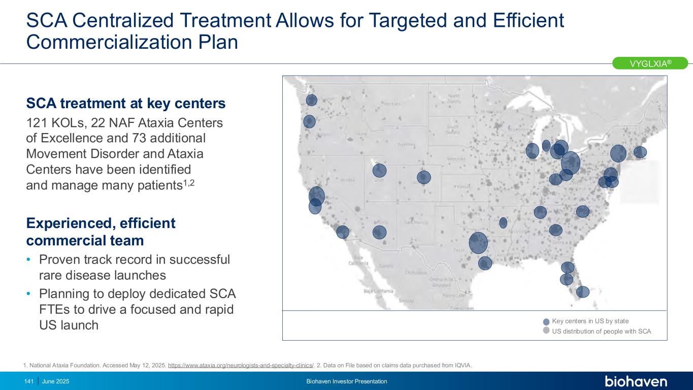 SCA集中治疗允许有针对性的高效商业化计划2025年6月Biohaven投资者介绍美国141个重点中心按州美国SCA1患者分布。国家共济失调基金会。于2025年5月12日访问。https://www.ataxia.org/neurologists-and-specialty-clinics/。2.Data on File based on claims data purchased from 艾昆纬。VYGLXIA®已确定在关键中心进行SCA治疗的121个KOL、22个NAF共济失调卓越中心和73个额外的运动障碍和共济失调中心,并管理了许多患者1、2经验丰富、高效的商业团队•在成功推出罕见病方面的可靠记录•计划部署专门的SCA FTE,以推动在美国的重点和快速推出
