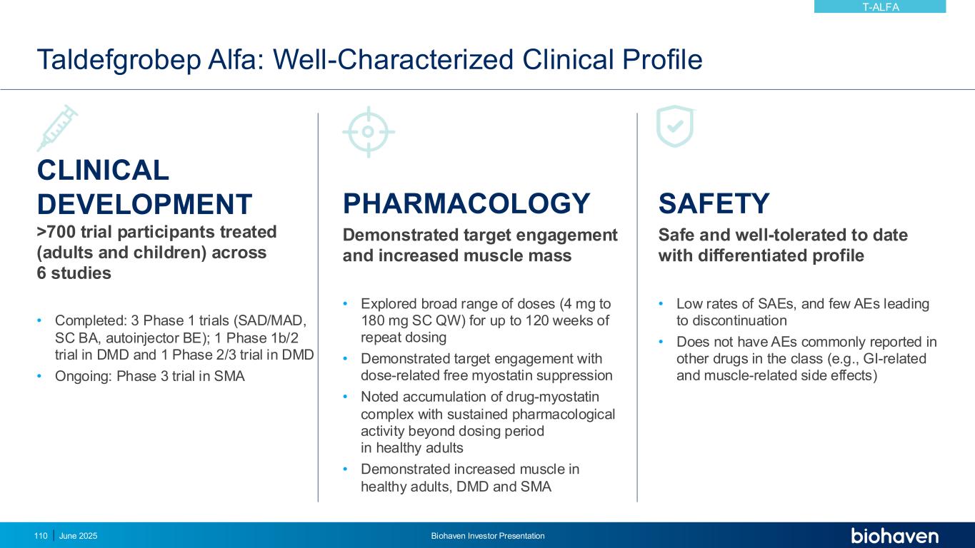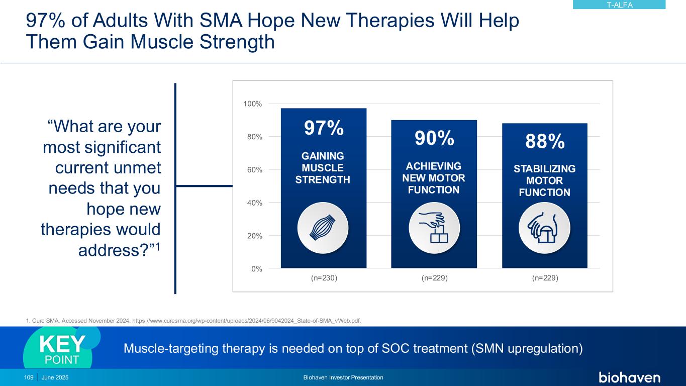 “你目前最重要的未满足需求是什么,你希望新疗法能解决这些需求?”1 97%的SMA成人希望新疗法能帮助他们增强肌肉力量1。治愈SMA。2024年11月访问。https://www.curesma.org/wp-content/uploads/2024/06/9042024_state-of-SMA_vWeb.pdf。97% 90% 88% 0% 20% 40% 60% 80% 100%(n = 230)(n = 229)(n = 229)获得肌肉强度实现新的运动功能稳定运动功能肌肉靶向治疗是SOC治疗之上需要的(SMN上调)关键点2025年6月Biohaven投资者介绍109 T-ALFA