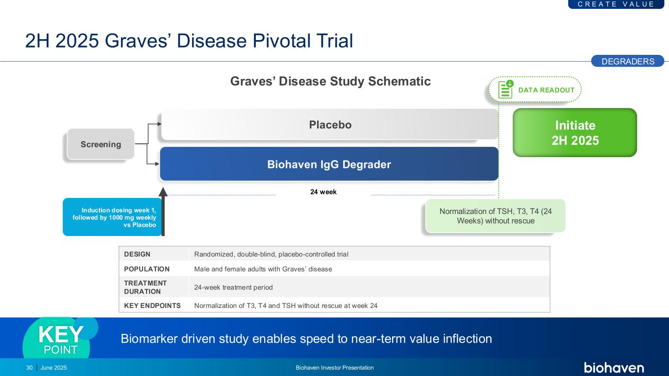 启动2H 2025 2H 2025 Graves病关键试验设计随机、双盲、安慰剂对照试验人群男性和女性成人Graves病治疗持续时间24周治疗期关键终点T3、T4和TSH在第24周无抢救的情况下正常化生物标志物驱动研究使速度接近近期值拐点关键点24周Biohaven IGG降解剂安慰剂筛查诱导给药第1周,随后每周1000mg vs安慰剂C R E A T E V A L U E降解剂30数据读取TSH、T3的正常化,T4(24周)无救援2025年6月Biohaven投资者报告会Graves的疾病研究示意图