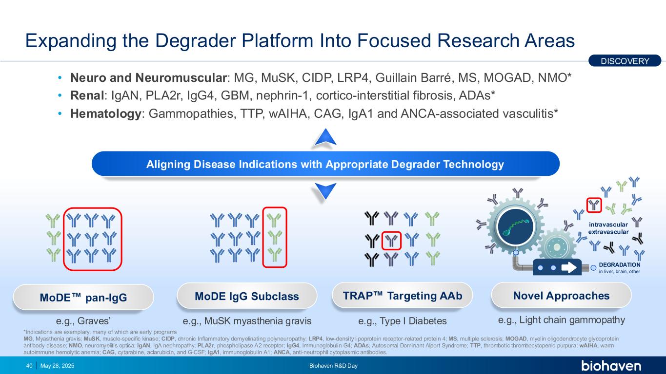 将降解器平台扩展到重点研究领域•神经和神经肌肉:MG、MSK、CIDP、LRP4、Guillain Barr é、MS、MOGAD、NMO*•肾脏:IgAN、PLA2r、IGG4、GBM、nephrin-1、皮质-间质纤维化、ADAs*•血液学:丙种球蛋白病、TTP、WAIHA、CAG、IGA1和ANCA相关血管炎*2025年5月28日Biohaven研发Day40发现模式泛IGG模式IGG亚类陷阱靶向AAB新方法降解肝脏、大脑、其他血管内血管外对齐疾病的适应症,采用适当的降解剂技术,例如Graves的,MuSK重症肌无力,I型糖尿病,例如轻链丙种球病*适应症堪称典范,很多都是早期项目MG、重症肌无力;musk、肌肉特异性激酶;CIDP,慢性炎症性脱髓鞘多发性神经病;LRP4,低密度脂蛋白受体相关蛋白4;MS,多发性硬化症;MOGAD,髓鞘少突胶质细胞糖蛋白抗体病;NMO,视神经脊髓炎;IGAN,IGA肾病;PLA2r,磷脂酶A2受体;IGG4,免疫球蛋白G4;ADAs,常染色体显性Alport综合征;TTP,血栓性血小板减少性紫癜;WAIHA,温性自身免疫性溶血性贫血;CAG,阿糖胞苷,阿克拉霉素,G-CSF;IGA1,免疫球蛋白A1;ANCA
