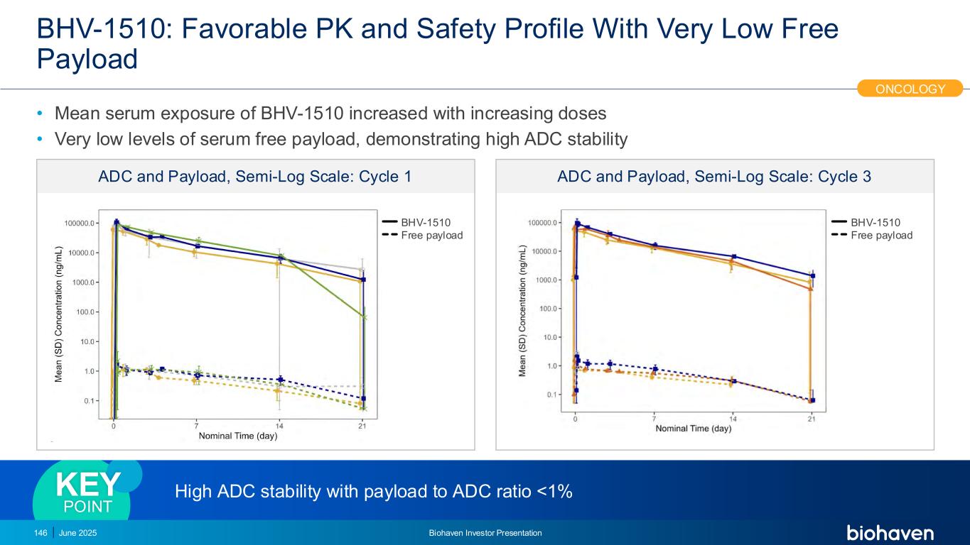 BHV-1510:有利的PK和安全概况,自由有效载荷非常低• BHV-1510的平均血清暴露量随着剂量的增加而增加•血清自由有效载荷水平非常低,显示出高ADC稳定性2025年6月Biohaven投资者介绍146来自正在进行的研究ADC和有效载荷的初步数据,半对数尺度:周期1 ADC和有效载荷,半对数尺度:周期3肿瘤学BHV-1510自由有效载荷BHV-1510自由有效载荷高ADC稳定性,有效载荷与ADC比率< 1%关键点