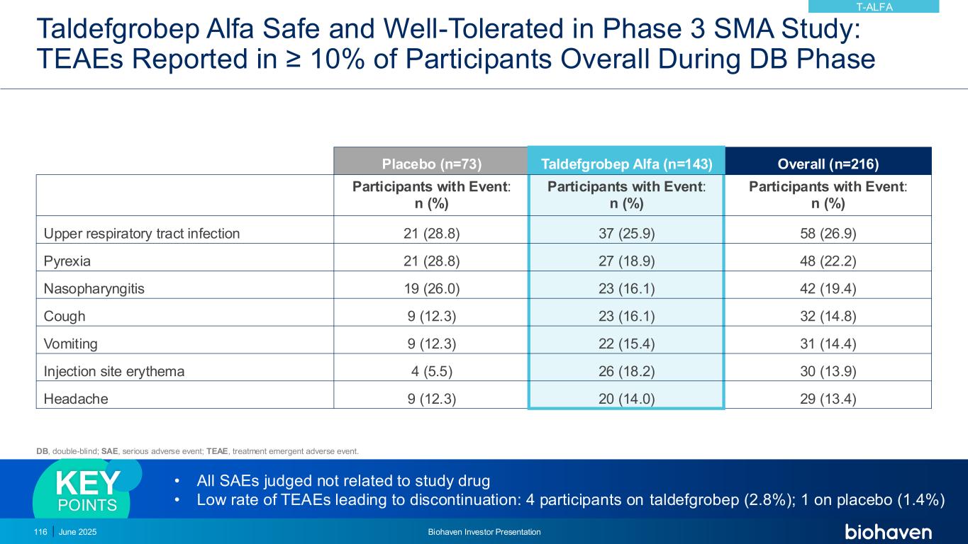 Taldefgrobep阿尔法保险箱且在3期SMA研究中耐受性良好:DB期期间报告的TEAEs总体上≥ 10%的参与者•所有被判定与研究药物无关的SAE •导致停药的TEAEs比率低:4名参与者使用taldefgrobep(2.8%);1名使用安慰剂(1.4%)关键点安慰剂(n = 73)taldefgrobep Alfa(n = 143)总体(n = 216)有事件的参与者:n(%)有事件的参与者:n(%)有事件的参与者:n(%)上呼吸道感染21(28.8)37(25.9)58(26.9)发热21(28.8)27(18.9)48(22.2)鼻咽炎19(26.0)23(16.1)42(19.4)咳嗽9(12.3)23(9(12.3)22(15.4)31(14.4)注射部位红斑4(5.5)26(18.2)30(13.9)头痛9(12.3)20(14.0)29(13.4)DB,双盲;SAE,严重不良事件;TEAEE,治疗紧急不良事件。2025年6月Biohaven投资者说明会116 T-ALFA