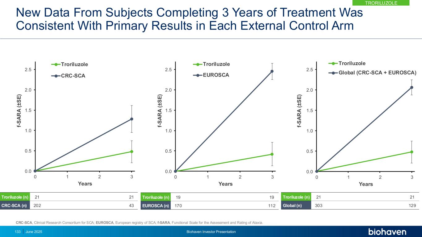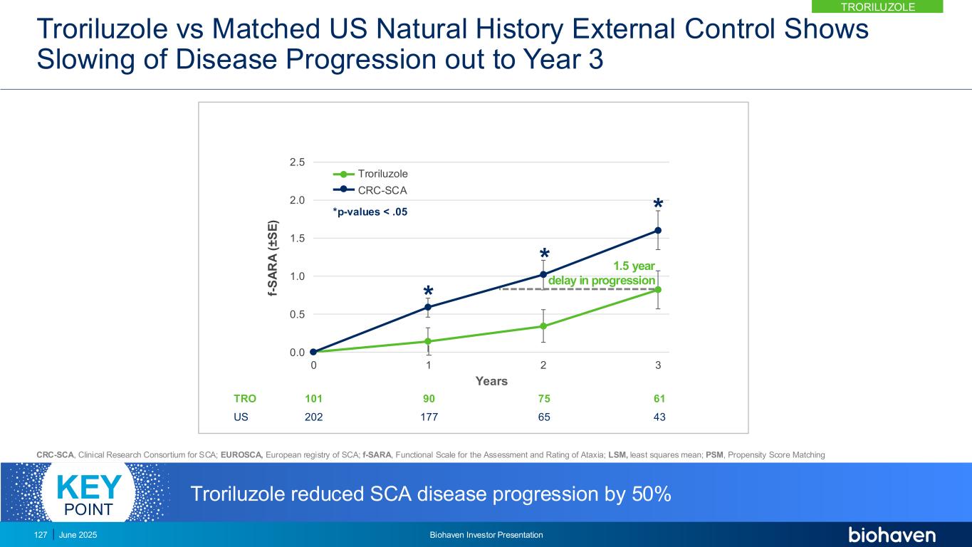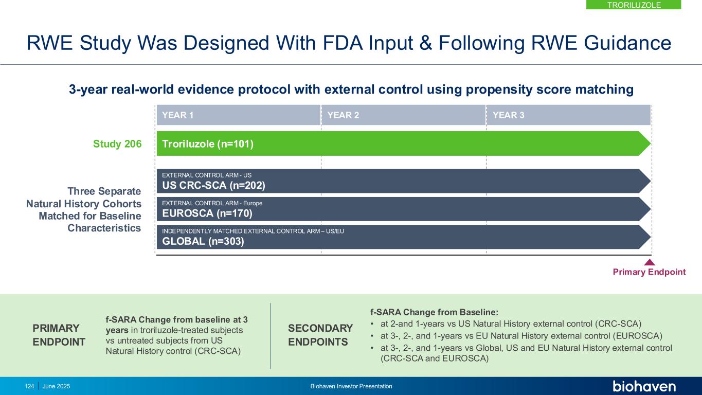 RWE研究采用FDA输入&遵循RWE指导的3年真实世界证据协议,使用倾向评分匹配年份3年1年2曲鲁唑(n = 101)研究206外部控制臂-美国美国CRC-SCA(n = 202)外部控制臂-欧洲EUROSCA(n = 170)独立匹配的外部控制臂–美国/欧盟全球(n = 303)三个独立的自然历史队列匹配对于基线特征主要终点f-SARA在3年时相对于基线的变化在曲雷鲁唑治疗的受试者与未经治疗的受试者的美国自然历史对照(CRC-SCA)主要终点f-SARA相对于基线的变化:•在2年和1年时vs美国自然历史外部对照(CRC-SCA)•在3年、2年和1年时vs欧盟自然历史外部对照(EUROSCA)•在3年、2年和1年时vs全球、美国和欧盟自然历史外部对照(CRC-SCA和EUROSCA)次要终点2025年6月124日Biohaven投资者介绍TroriluZOLE