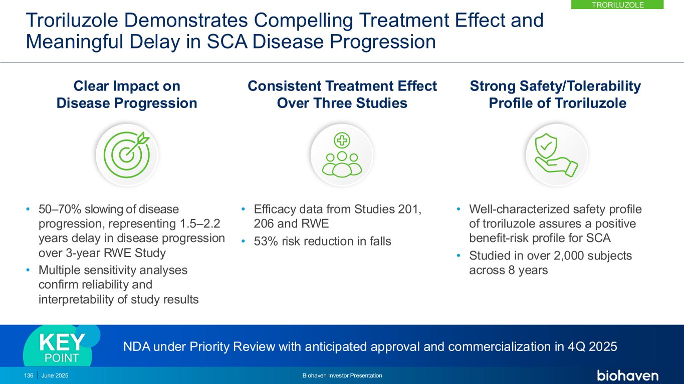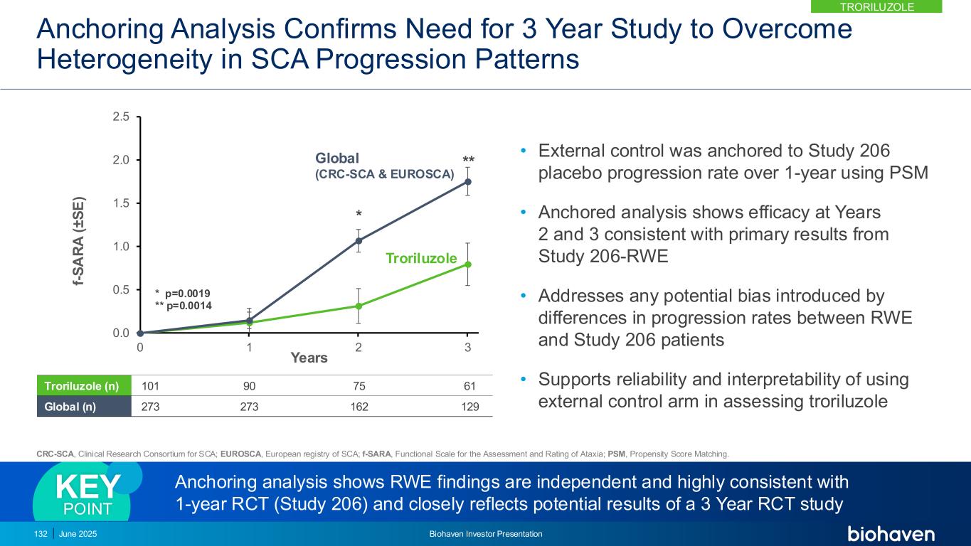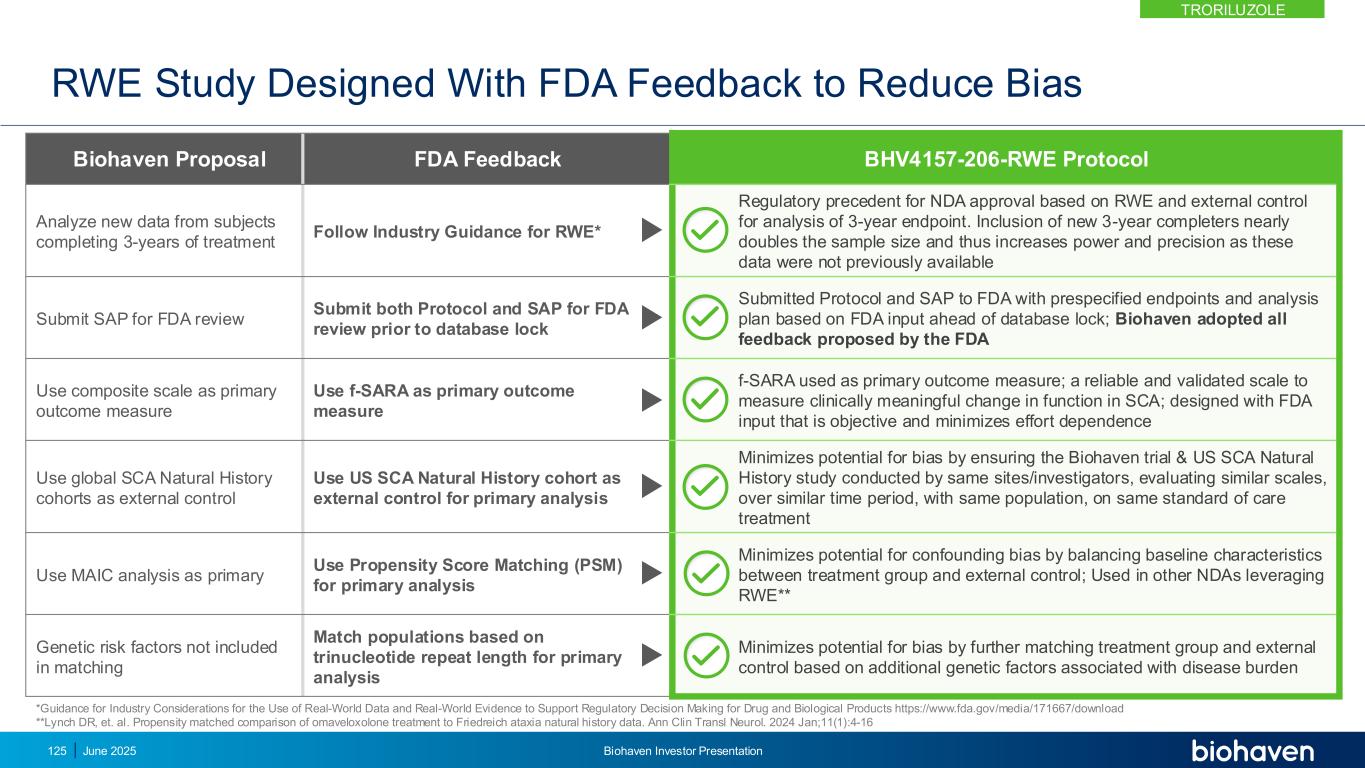 RWE研究采用FDA输入&遵循RWE指导的3年真实世界证据协议,使用倾向评分匹配年份3年1年2曲鲁唑(n = 101)研究206外部控制臂-美国美国CRC-SCA(n = 202)外部控制臂-欧洲EUROSCA(n = 170)独立匹配的外部控制臂–美国/欧盟全球(n = 303)三个独立的自然历史队列匹配对于基线特征主要终点f-SARA在3年时相对于基线的变化在曲雷鲁唑治疗的受试者与未经治疗的受试者的美国自然历史对照(CRC-SCA)主要终点f-SARA相对于基线的变化:•在2年和1年时vs美国自然历史外部对照(CRC-SCA)•在3年、2年和1年时vs欧盟自然历史外部对照(EUROSCA)•在3年、2年和1年时vs全球、美国和欧盟自然历史外部对照(CRC-SCA和EUROSCA)次要终点2025年6月124日Biohaven投资者介绍TroriluZOLE