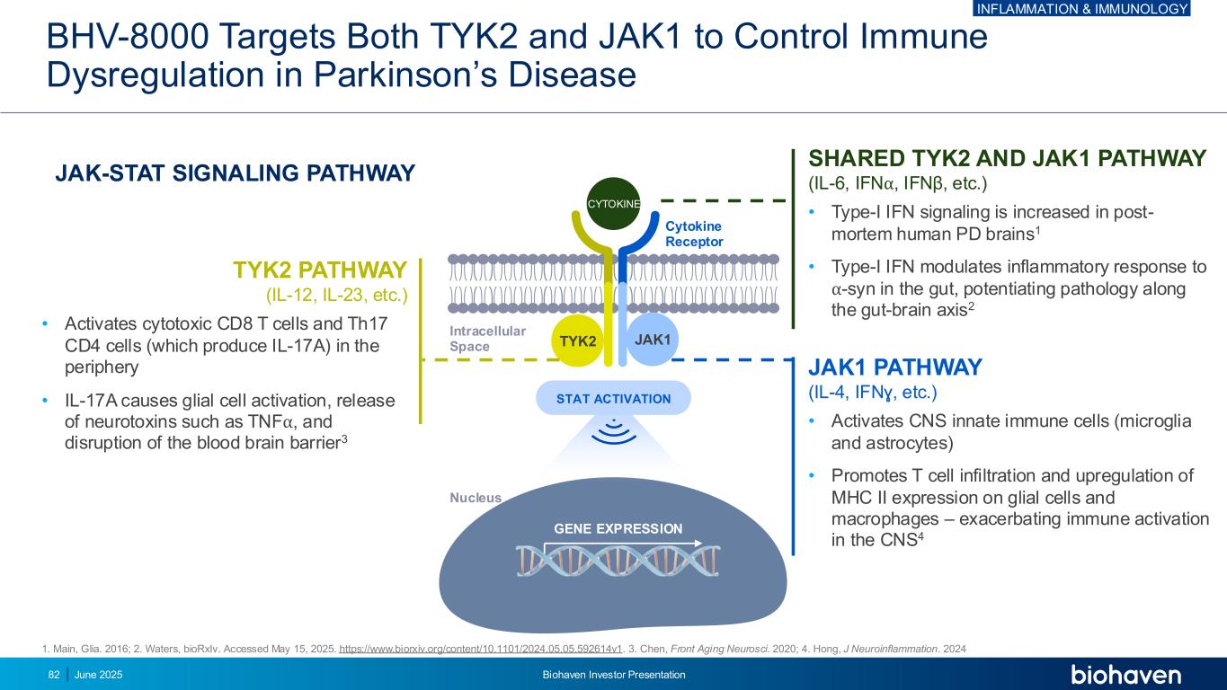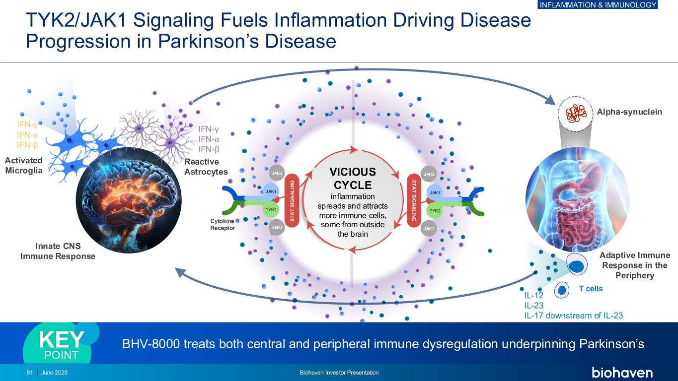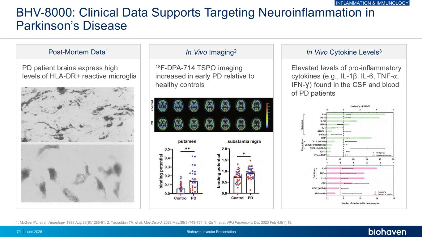 ` BHV-8000:临床数据支持靶向帕金森病神经炎症的体内细胞因子水平3在PD患者的CSF和血液中发现的促炎细胞因子(例如IL-1 β、IL-6、TNF-β、IFN-β)水平升高vivo Imaging2 18F-DPA-714 TSPO成像在早期PD中相对于健康对照增加死后数据1 PD患者大脑表达高水平的HLA-DR +反应性小胶质细胞1。McGeer PL,et al. Neurology。1988年8月;38(8):1285-91。2.Yacoubian TA,et al. Mov Disord。2023年5月;38(5):743-754。3.Qu Y,et al. NPJ帕金森氏症诊断。2023年2月4日;9(1):18。炎症与免疫学2025年6月Biohaven投资者说明会79