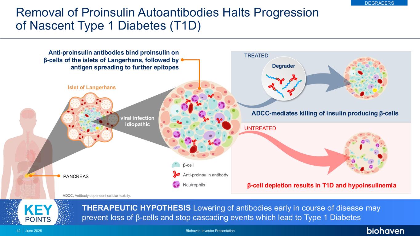 去除胰岛素原自身抗体可阻止新生1型糖尿病(T1D)的进展2025年6月Biohaven投资者介绍42 Langerhans PANCREAS β细胞耗竭的胰岛可导致T1D和低胰岛素血症ADCC介导的对产生胰岛素的β细胞的杀伤未治疗的病毒感染特发性治疗的β细胞抗胰岛素原抗体中性粒细胞降解剂ADCC,抗体依赖性细胞毒性。病程早期的治疗性低位抗体可能会阻止β细胞的丢失,并停止导致1型糖尿病的级联事件关键点抗胰岛素原抗体结合朗格汉斯胰岛β细胞上的胰岛素原,随后抗原扩散到进一步的表位降级器
