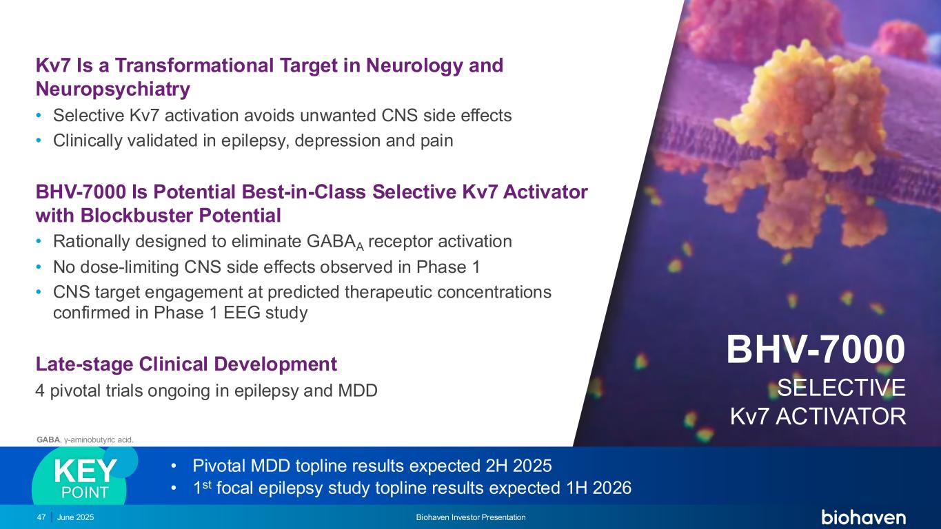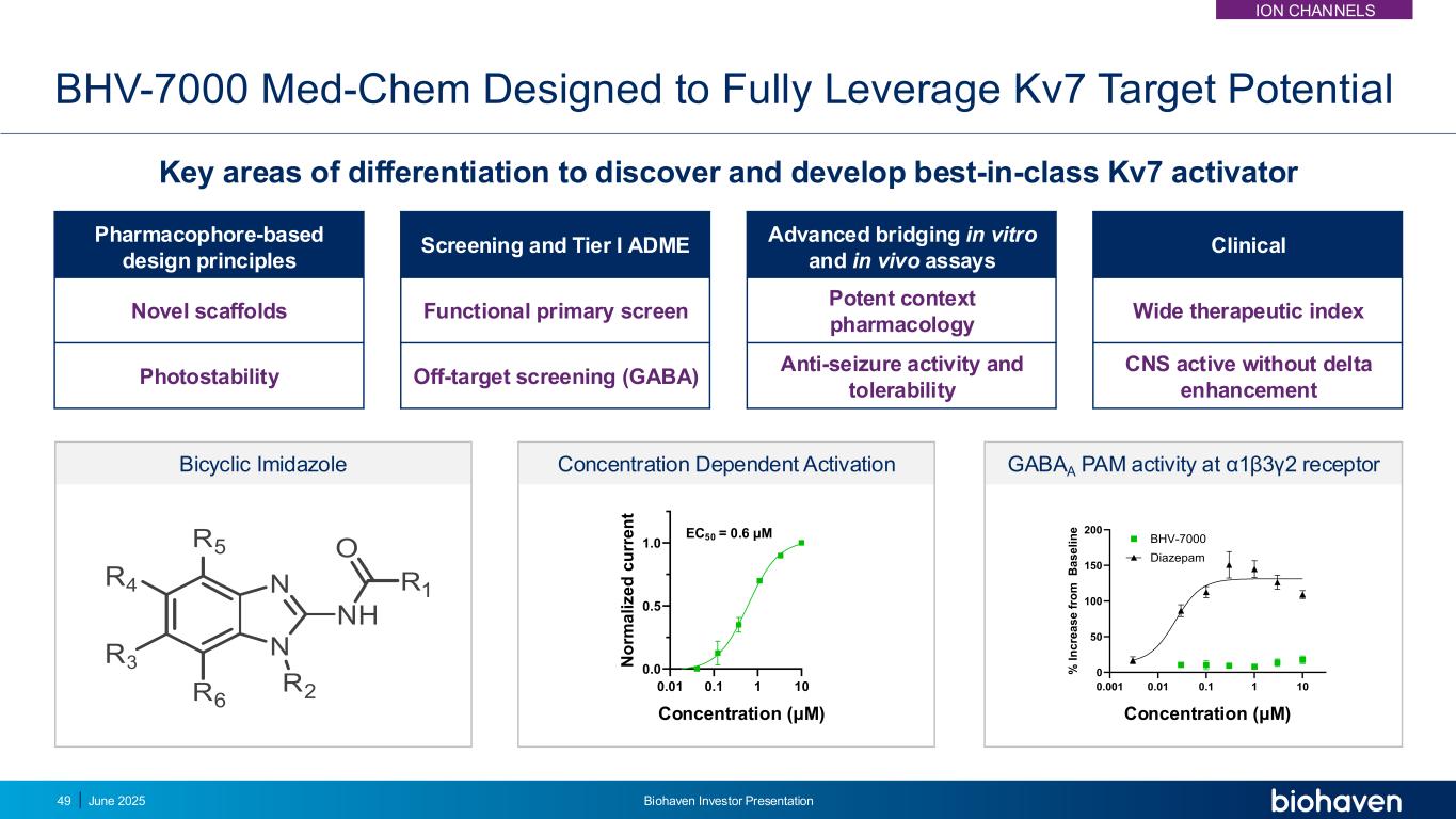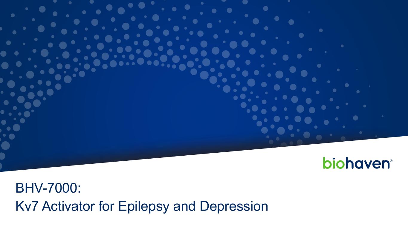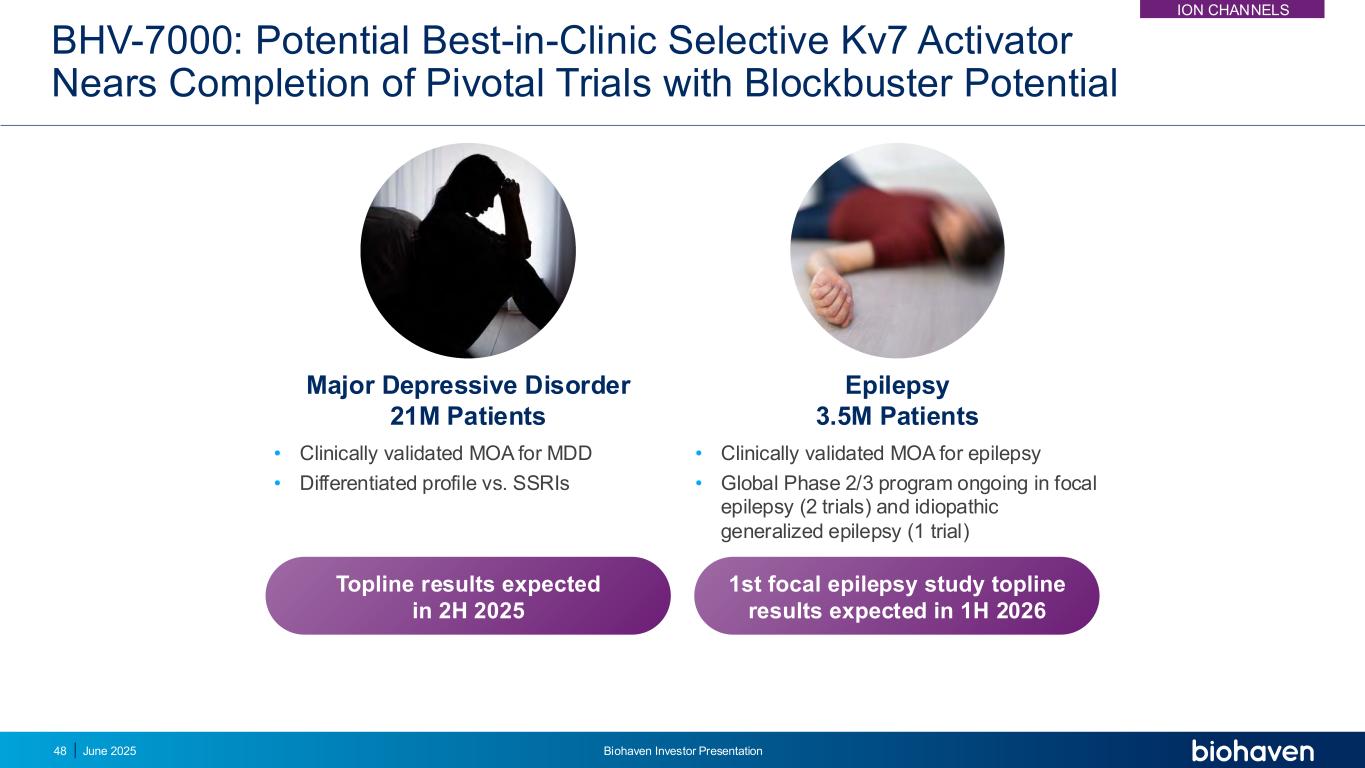 BHV-7000:潜在的最佳临床选择性KV7激活剂接近完成与重磅潜在癫痫350万患者的关键试验•临床验证的用于癫痫的MOA •局灶性癫痫(2项试验)和特发性全身性癫痫(1项试验)的全球2/3期计划正在进行中的主要抑郁症21M患者•临床验证的用于MDD的MOA •区分轮廓与SSRIs顶线结果预计在2H 2025预计在1H 2026 ION CHANNELS 2025年6月预计在1H的第一个局灶性癫痫研究顶线结果Biohaven投资者介绍48