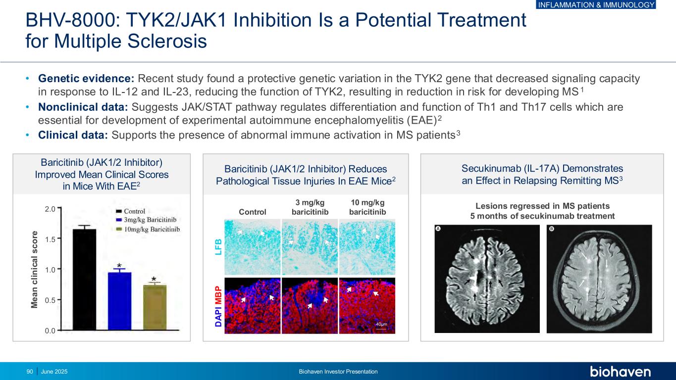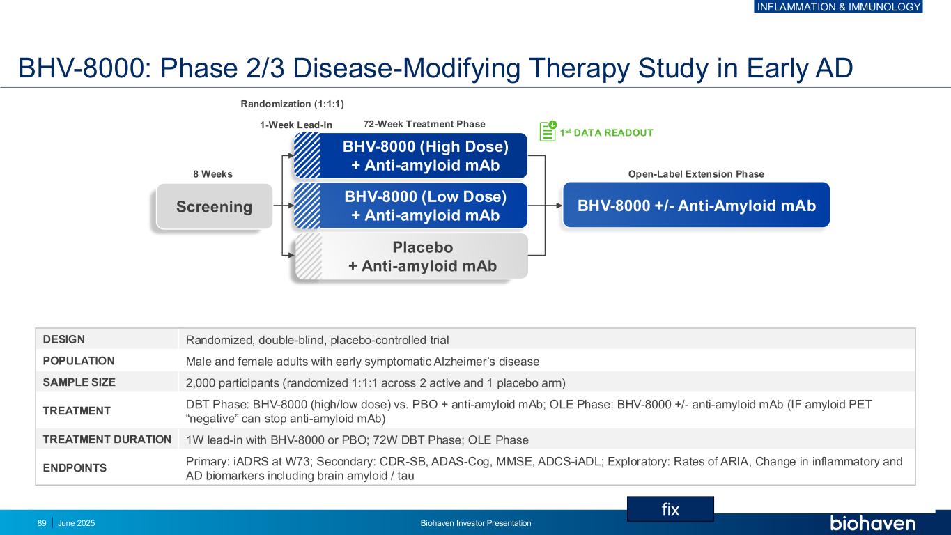 BHV-8000:早期AD设计随机、双盲、安慰剂对照试验人群中的2/3期疾病改变疗法研究早期有症状的阿尔茨海默病样本规模2,000名参与者(随机1:1:1跨2个活性和1个安慰剂组)治疗DBT期:BHV-8000(高/低剂量)vs. PBO +抗淀粉样蛋白MAb;OLE期:BHV-8000 +/-抗淀粉样蛋白MAb(如果淀粉样蛋白PET“阴性”可停止抗淀粉样蛋白MAb)治疗持续时间1W导入BHV-8000或PBO;72W DBT期;OLE期ENEN包括脑淀粉样/tau BHV-8000 +/-抗淀粉样mAB BHV-8000(高剂量)+抗淀粉样mAB BHV-8000(低剂量)+抗淀粉样mAB安慰剂+抗淀粉样mAB 72周治疗阶段1周导入随机化(1:1:1)开放标签扩展阶段8周第1次数据读出筛查炎症和免疫学2025年6月Biohaven投资者介绍89 fix