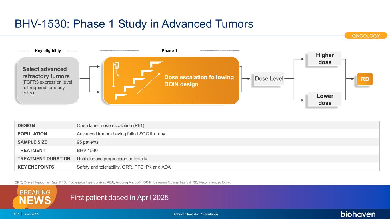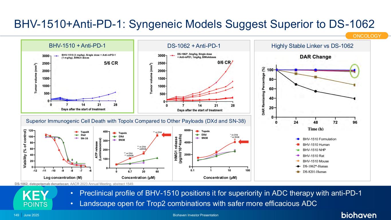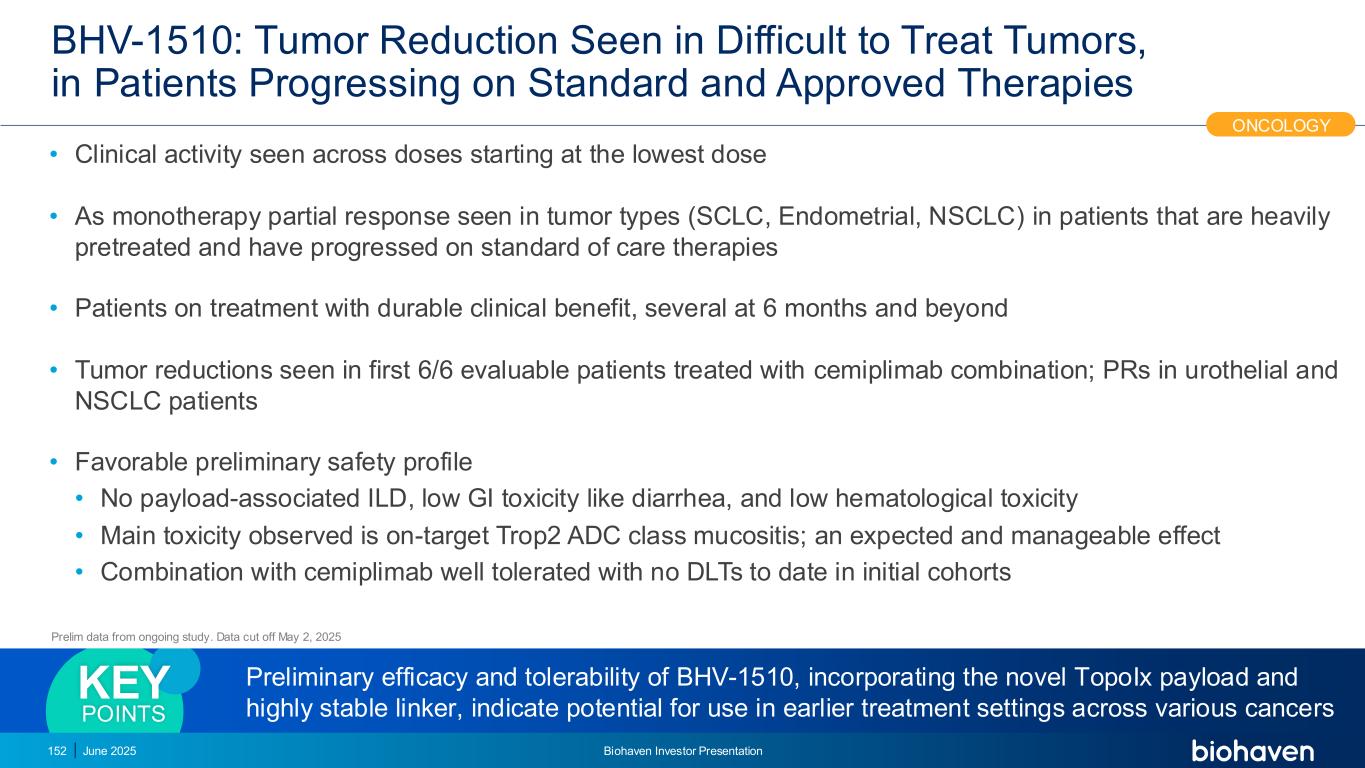 BHV-1510:在难以治疗的肿瘤中,在标准和批准的疗法上取得进展的患者中看到肿瘤减少•从最低剂量开始的跨剂量观察到的临床活动•作为在肿瘤类型(SCLC、子宫内膜、NSCLC)中看到的单一疗法部分反应,在经过大量预处理并在标准护理疗法上取得进展的患者中看到•接受具有持久临床获益的治疗的患者,一些在6个月及更长时间•在接受cemiplimab联合治疗的前6/6名可评估患者中看到肿瘤减少;在尿路上皮和NSCLC患者中出现PR •有利的初步安全性特征•没有有效载荷相关的ILD,像腹泻一样的低GI毒性,以及低血液学毒性•观察到的主要毒性是靶向Trop2 ADC类粘膜炎;预期且可控的效果•与cemiplimab联合使用具有良好耐受性且迄今为止在初始队列中没有DLT的2025年6月Biohaven投资者介绍152肿瘤学BHV-1510的初步疗效和耐受性,结合了新型TopoIX有效载荷和高度稳定的连接子,表明在跨越各种癌症的早期治疗环境中具有使用潜力,关键是正在进行的研究的初步数据。数据截止2025年5月2日
