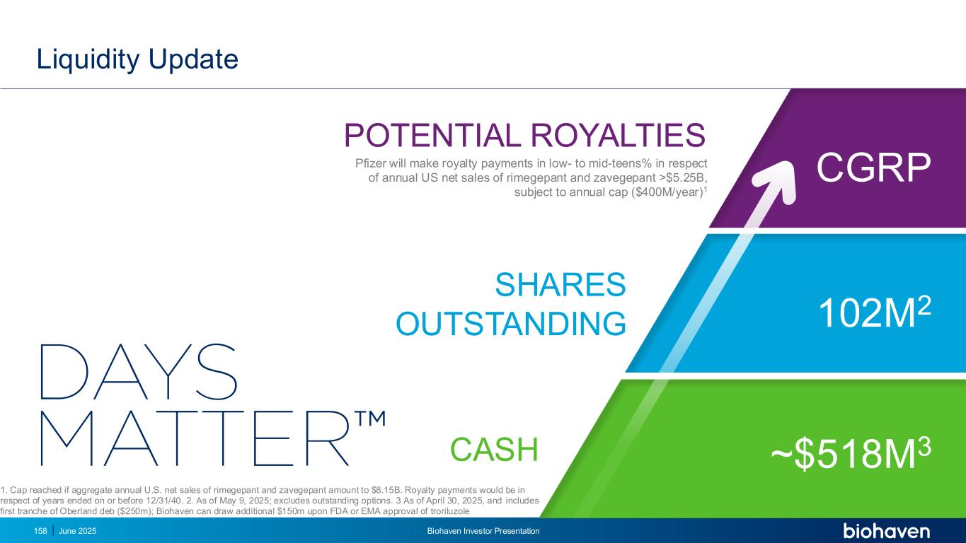 流动性更新现金股未偿还潜在特许权使用费辉瑞将就rimegepant和zavegepant的年度美国净销售额> $ 5.25B支付中低10%的特许权使用费,但须遵守年度上限($ 400m/year)1~$ 518m3 102m2 CGRP 2025年6月丨Biohaven丨投资者介绍158。如果rimegepant和zavegepant在美国的年度净销售额总额达到8.15B美元,则达到上限。特许权使用费将针对在12/31/40或之前结束的年份支付。2.截至2025年5月9日;不包括未完成的期权。3截至2025年4月30日,并包括第一期Oberland DeB(2.5亿美元);一旦FDA或EMA批准曲鲁唑,Biohaven可以额外提取1.5亿美元