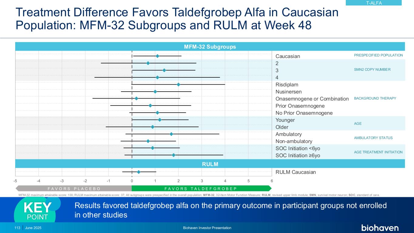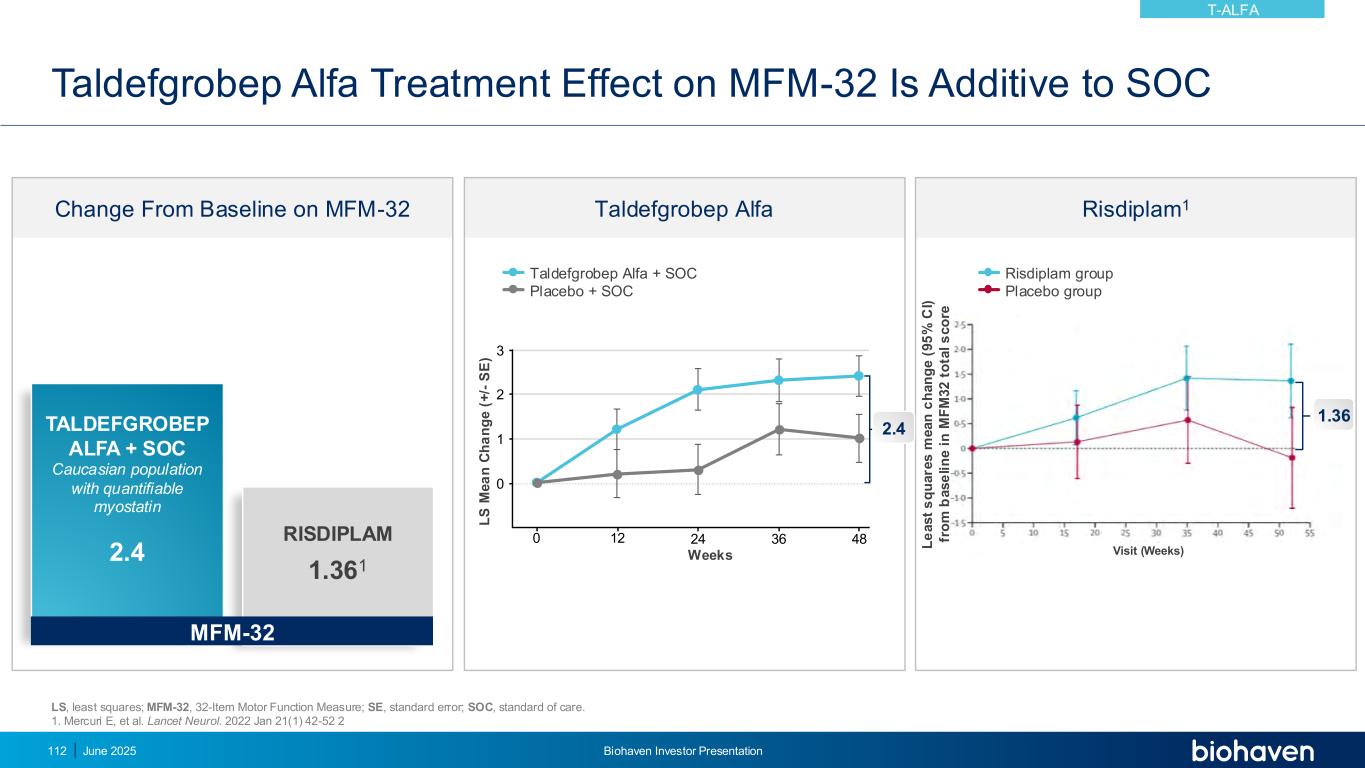 taldefgrobep Alfa对MFM-32的治疗效果与SOC MFM-32相加taldefgrobep ALFA + SOC高加索人群与可量化的肌肉抑制素1.36 12.4 RISDIPLAM L e a s t s q u a re s m e a n c h a n g e(95.5% C I)fr o m b a s e li n e i n i n m f m 32 t o ta l s c o re Risdiplam group placebo group change from baseline on MFM-32 Risdiplam1taldefgrobep Alfa 1.36 visit(weeks)LS,最小二乘法;MFM-32,32项运动功能测量;SE,标准误差;SOC,护理标准。1.Mercuri E,et al. Lancet Neurol。2022年1月21日(1)42-52 20122436480123 L S M e a n C h a n g e(+/-s e)weeks taldefgrobep alfa + SOC placebo + SOC 2.4 June 2025 Biohaven投资者说明会112 T-ALFA