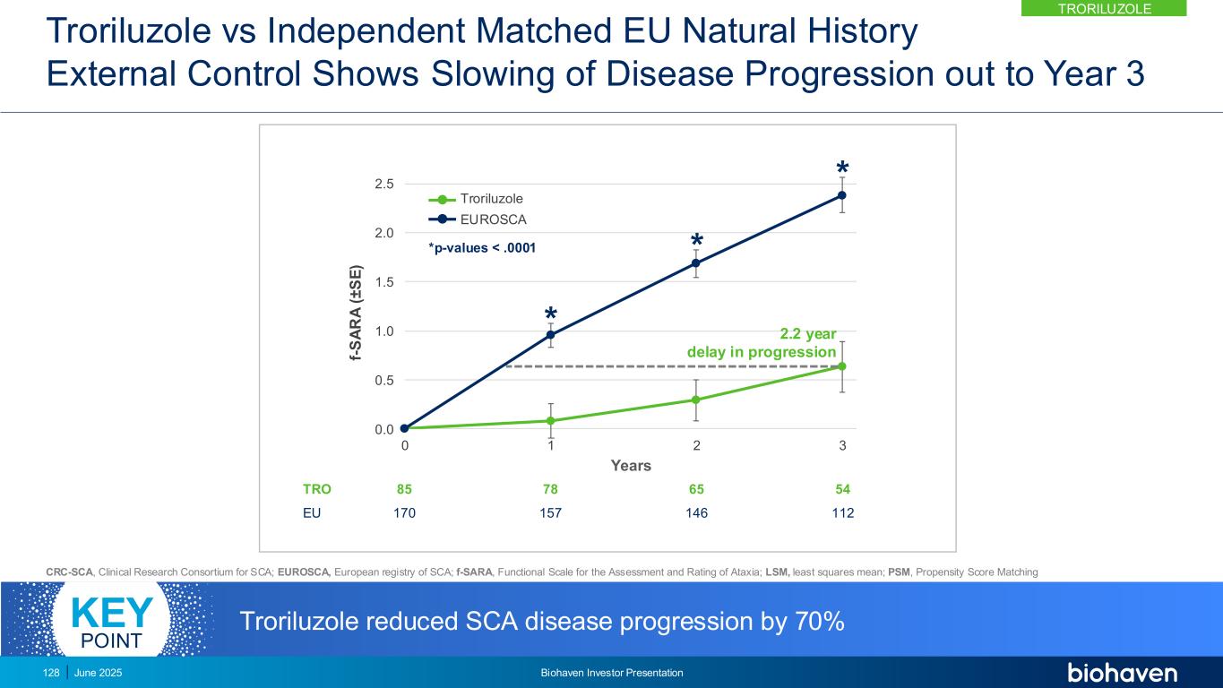 Troriluzole vs Matched US Natural History External Control shows slowing of disease progression out to Year 3 CRC-SCA,SCA clinical research consortium for SCA;EUROSCA,European registry of SCA;f-SARA,functional scale for assessment and rating of ataxia;LSM,最小二乘法均值;PSM,倾向得分匹配0.0 0.5 1.0 1.5 2.0 2.50123 f-S A R A(± S E)年***p值<.05曲瑞鲁唑CRC-SCA TRO美国1012029017775656143*进展延迟1.5年特曲鲁唑使SCA疾病进展减少50%关键点特曲鲁唑2025年6月Biohaven投资者说明会127