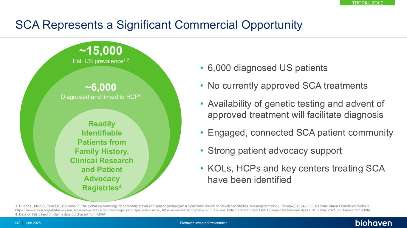 SCA代表了一个重要的商业机会• 6,000名确诊的美国患者•目前没有批准的SCA治疗•基因检测的可用性和批准的治疗方法的出现将促进诊断•参与、连接的SCA患者社区•强大的患者倡导支持• KOL、HCP和治疗SCA的关键中心已从家族史、临床研究和患者倡导登记中确定了易于识别的患者4~6,000名经诊断并与HCP3~15,000 EST相关的患者。美国流行率1,21。Ruano L、Melo C、Silva MC、Coutinho P.遗传性共济失调和痉挛性截瘫的全球流行病学:患病率研究的系统综述。神经流行病学。2014;42(3):174-83.2.国家共济失调基金会网站:https://www.ataxia.org/what-is-ataxia/,https://www.ataxia.org/neurologists-and-specialty-clinics/,https://www.ataxia.org/crc-sca/。3.来源:2016年4月至2021年3月期间从LAAD索赔数据过滤的患者从艾昆纬购买。4.Data on File based on claims data purchased from 艾昆纬。特仑苏2025年6月Biohaven投资者说明会137