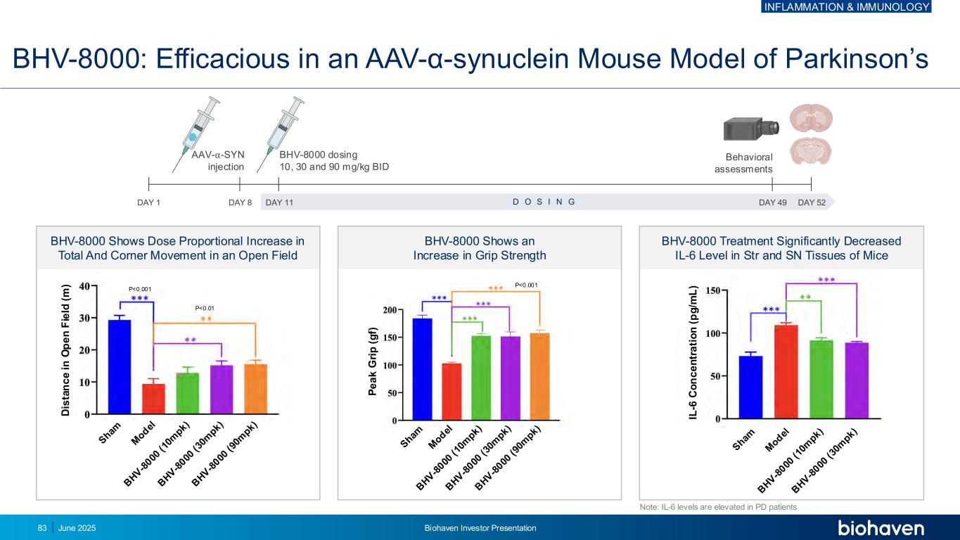 BHV-8000:在帕金森BHV-8000的AAV-α-突触核蛋白小鼠模型中有效显示在开阔场地中总和转角运动的剂量比例增加BHV-8000显示握力增加p < 0.001 p < 0.01 p < 0.001 BHV-8000治疗显著降低STR中IL-6水平和SN组织小鼠注意:PD患者IL-6水平升高D为TA n c e i n o p e n f ie ld(m)p e a k g ri p(g f)IL-6 c o n c e n tr a ti o n(p g/m l)AAV--SYN注射液BHV-8000剂量10、30和90mg/kg BID DAY1 DAY8 DAY11 DAY49 DAY52D O S I N G行为评估炎症和免疫学2025年6月Biohaven投资者介绍83