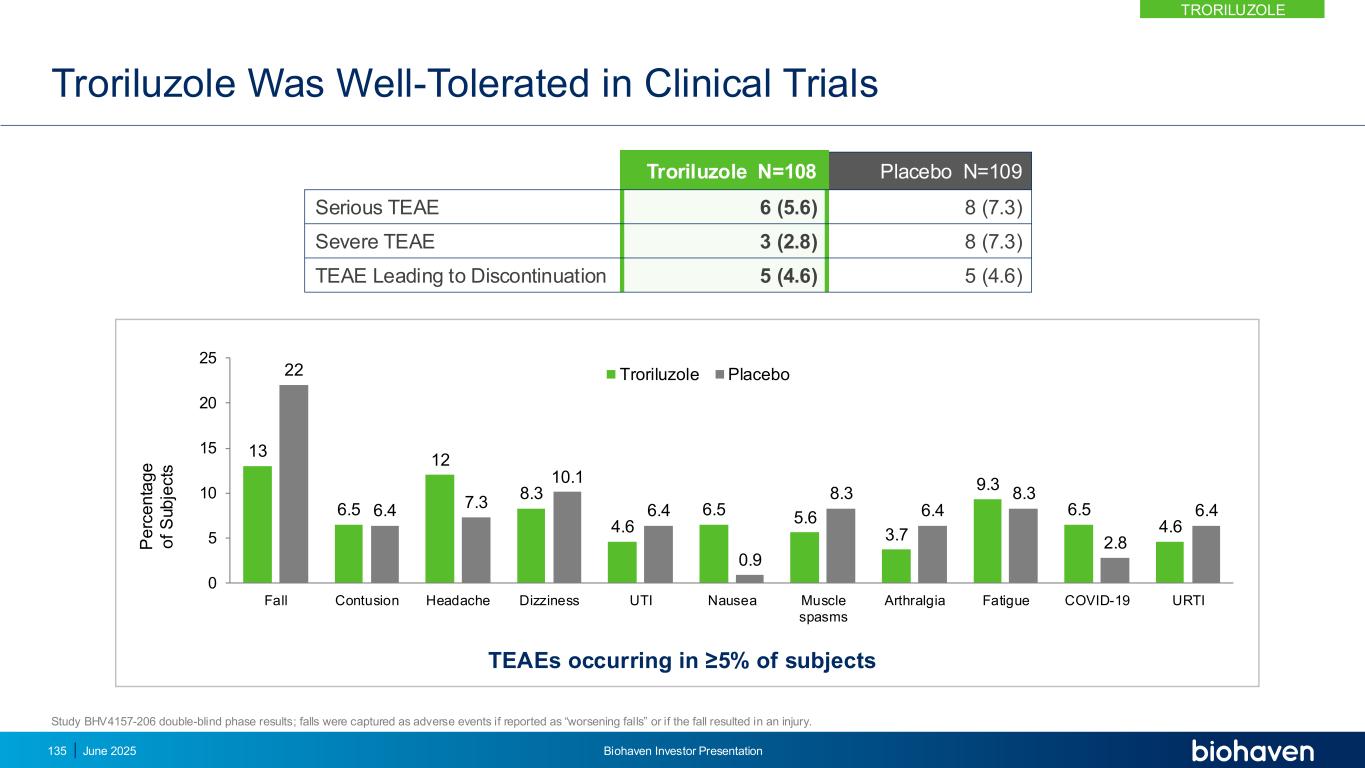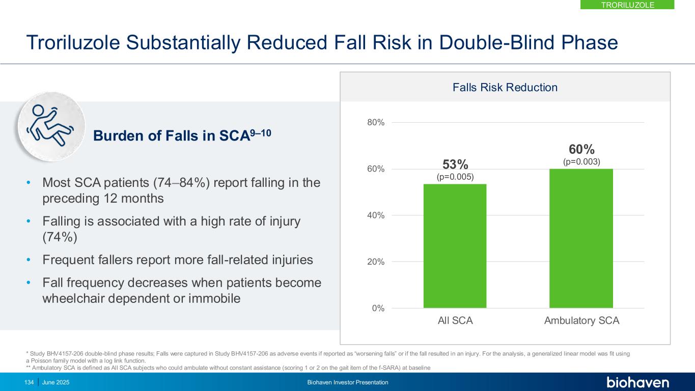SCA9 – 10中的跌倒负担•大多数SCA患者(74 – 84%)报告在过去12个月内跌倒•跌倒与高受伤率相关(74%)•经常跌倒的人报告更多与跌倒相关的伤害•当患者依赖轮椅或无法移动时跌倒频率降低跌倒风险降低曲鲁唑在双盲阶段大幅降低跌倒风险*研究BHV4157-206双盲阶段结果;如果报告为“更严重的跌倒”或跌倒导致受伤,则在研究BHV4157-206中将跌倒记录为不良事件。为了进行分析,使用具有对数链接函数的泊松族模型拟合了广义线性模型。**动态SCA定义为所有SCA受试者在基线53%(p = 0.005)60%(p = 0.003)0% 20% 40% 60% 80%所有SCA动态SCA TRRORILUZOLE2025年6月Biohaven投资者介绍134