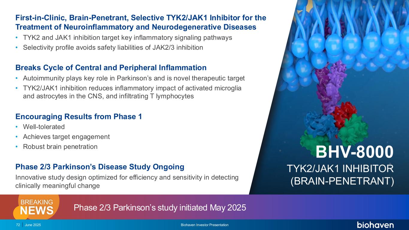 BHV-8000同时靶向TYK2和JAK1控制帕金森病的免疫失调821。梅因,格利亚。2016; 2.沃特斯,bioRXIV。2025年5月15日访问。https://www.biorxiv.org/content/10.1101/2024.05.05.592614v1。3.陈,前衰老神经科学。2020; 4.洪,J神经炎症。2024 STAT激活基因表达细胞因子受体JAK1TYK2细胞因子JAK-STAT信号通路共享TYK2和JAK1通路(IL-6、IFN β、IFN β等)• I型IFN信号在死后人类PD脑中增加1 • I型IFN调节肠道对-syn的炎症反应,沿肠道-脑轴2 JAK1通路增强病理(IL-4、IFN丨等)•激活CNS先天免疫细胞(小胶质细胞和星形胶质细胞)•促进T细胞浸润和上等)•激活外周细胞毒性CD8 T细胞和TH17 CD4细胞(产生IL-17A)• IL-17A引起神经胶质细胞活化,释放TNF β等神经毒素,破坏血脑屏障3细胞内空间核2025年6月Biohaven投资者介绍炎症与免疫学