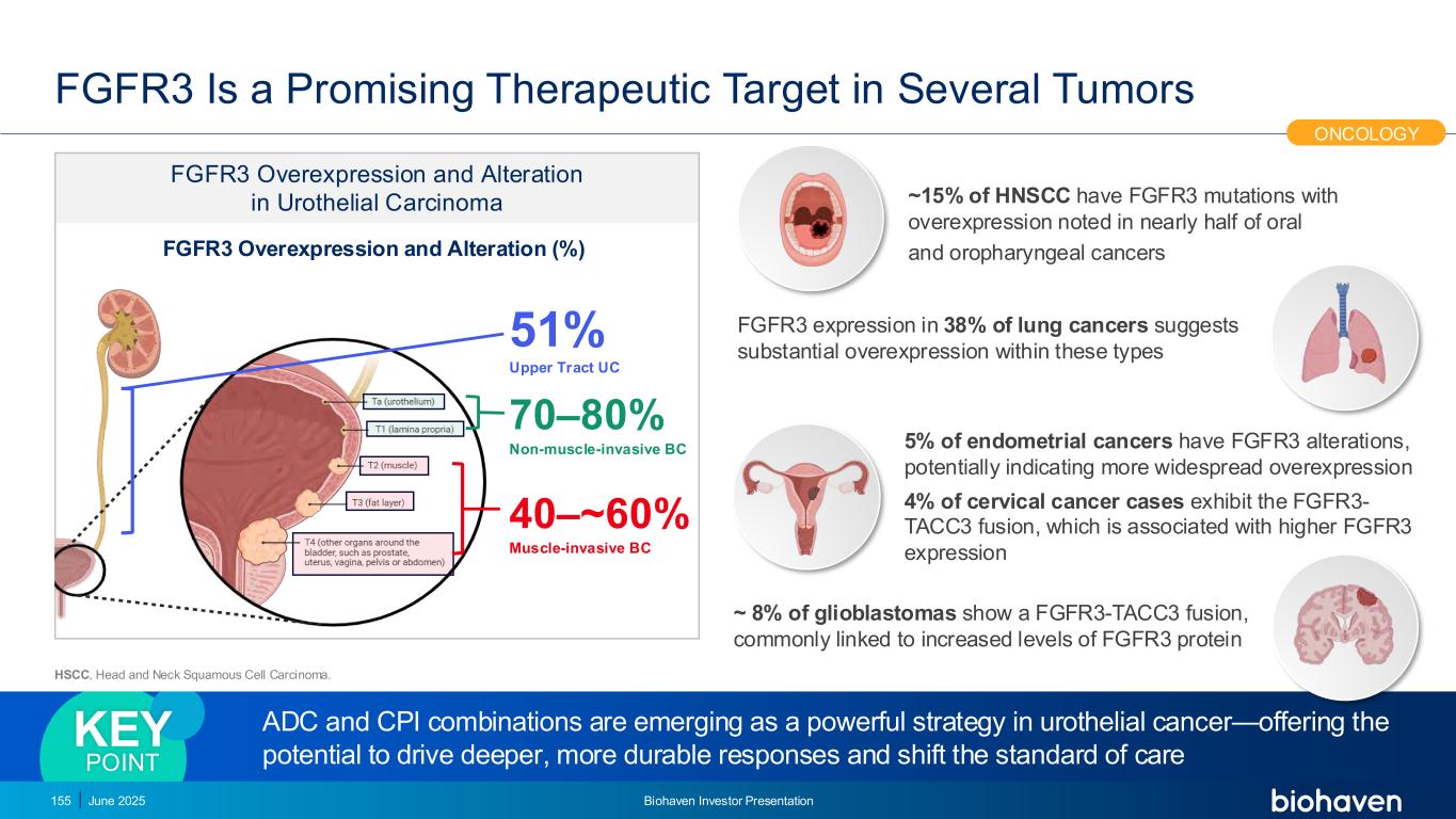 FGFR3是几种肿瘤中一个很有希望的治疗靶点2025年6月Biohaven投资者介绍155肿瘤学5%的子宫内膜癌有FGFR3改变,可能表明更广泛的过表达4%的宫颈癌病例表现出FGFR3-TACC3融合,与38%的肺癌中更高的FGFR3表达相关FGFR3表达提示这些类型内存在实质性过表达FGFR3在尿路上皮癌中的过度表达和改变FGFR3过度表达和改变(%)51%上束UC 40 –~60%肌肉浸润性BC 70 – 80%非肌肉浸润性BC~15%的HNSCC具有FGFR3突变,在近一半的口腔和口咽癌ADC和CPI组合中发现了过表达,这正在成为尿路上皮癌的一种强有力的策略——提供了推动更深入、更持久的反应和改变护理标准的潜力关键点~8%的胶质母细胞瘤显示FGFR3-TACC3融合,通常与FGFR3蛋白HSCC、头颈部鳞状细胞癌水平升高有关。
