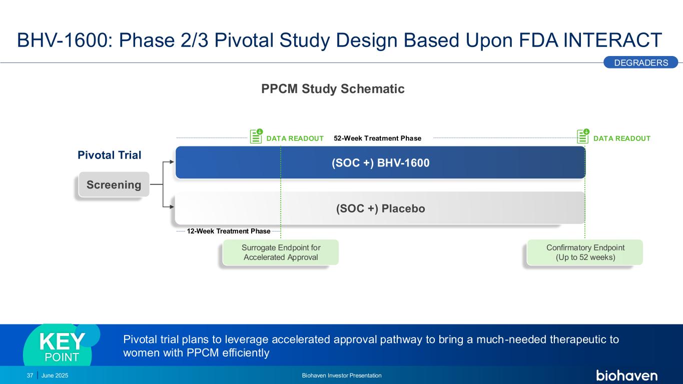 12周治疗阶段52周治疗阶段(SOC +)BHV-1600(SOC +)安慰剂筛查BHV-1600:基于FDA InterACT37关键试验替代终点的2/3期关键研究设计加速批准数据读取数据读取证实终点(最长52周)降级器关键试验计划利用加速批准途径为患有PPCM的女性带来急需的治疗方法关键点2025年6月Biohaven投资者介绍PPCM研究示意图