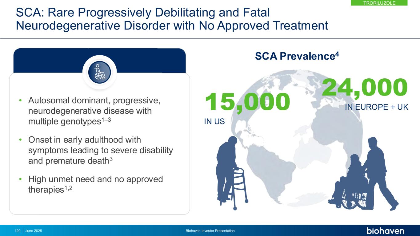 •具有多种基因型的常染色体显性、进展性、神经退行性疾病1 – 3 •在成年早期发病,症状导致严重残疾和过早死亡3 •高度未满足的需求和未获批准的疗法1,2 SCA:罕见的进展性使人衰弱和致命性神经退行性疾病,未获批准的治疗SCA流行率4欧洲24,000 +英国15,000美国曲鲁唑2025年6月Biohaven投资者介绍120