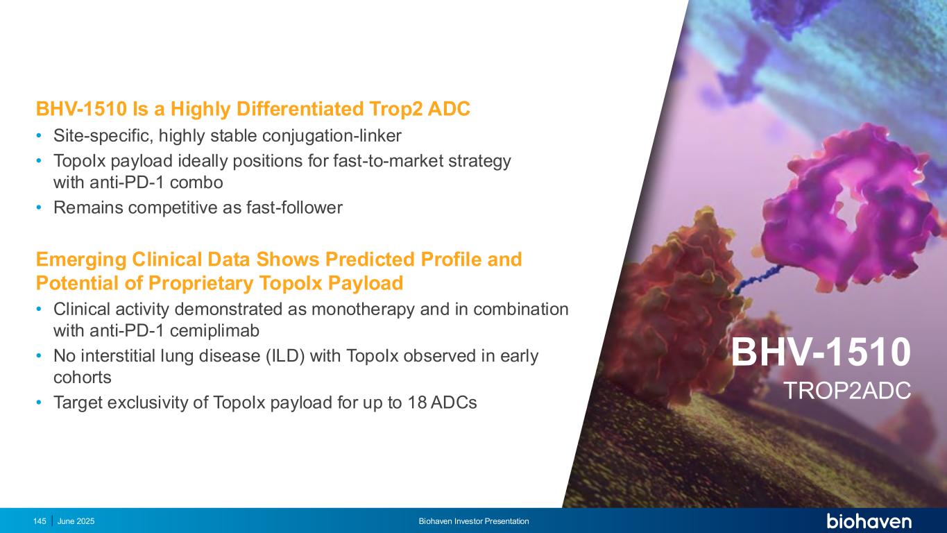 BHV-1510是一种高度差异化的Trop2 ADC •针对特定部位、高度稳定的偶联连接器• TopoIX有效载荷非常适合采用抗PD-1组合的快速上市战略•由于快速跟随性的新兴临床数据显示了专有TopoIX有效载荷的预测概况和潜力,因此保持竞争力•作为单一疗法和与抗PD-1 cemiplimab联合使用证明的临床活性•在早期队列中未观察到与TopoIX的间质性肺病(ILD)• TopoIX有效载荷对多达18个ADC的靶点独占性2025年6月Biohaven投资者介绍145 BHV-1510 TROP2ADC