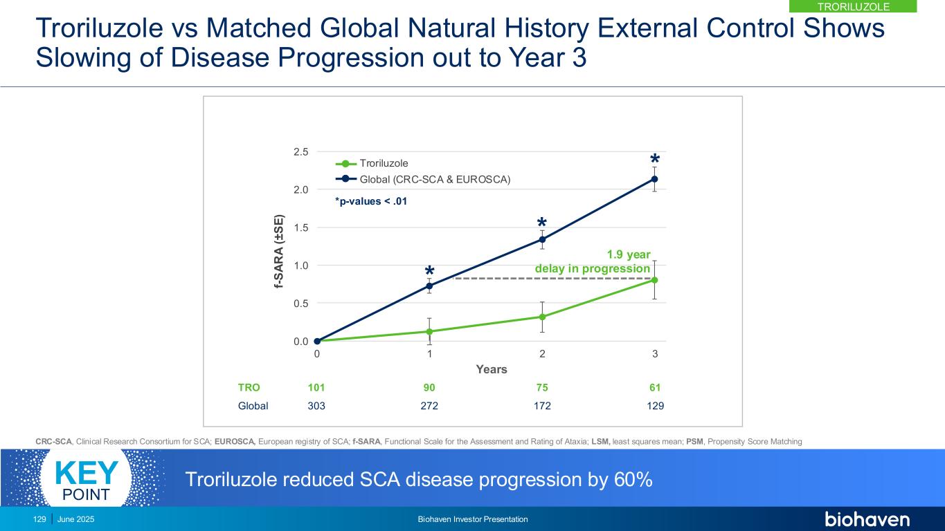 0.0 0.5 1.0 1.5 2.0 2.50123 f-S A R A(± S E)年***TRO全球101303902727517261129*p值<.01 Troriluzole Global(CRC-SCA & EUROSCA)进展延迟1.9年Troriluzole将SCA疾病进展减少60%关键点Troriluzole 2025年6月Biohaven投资者介绍129 Troriluzole vs Matched Global Natural History External Control显示疾病进展放缓至第3年CRC-SCA,SCA的临床研究联盟;EUROSCA,SCA的欧洲注册处;f-SARA,共济失调评估评级功能量表;LSM,最小二乘均值;PSM,倾向得分匹配