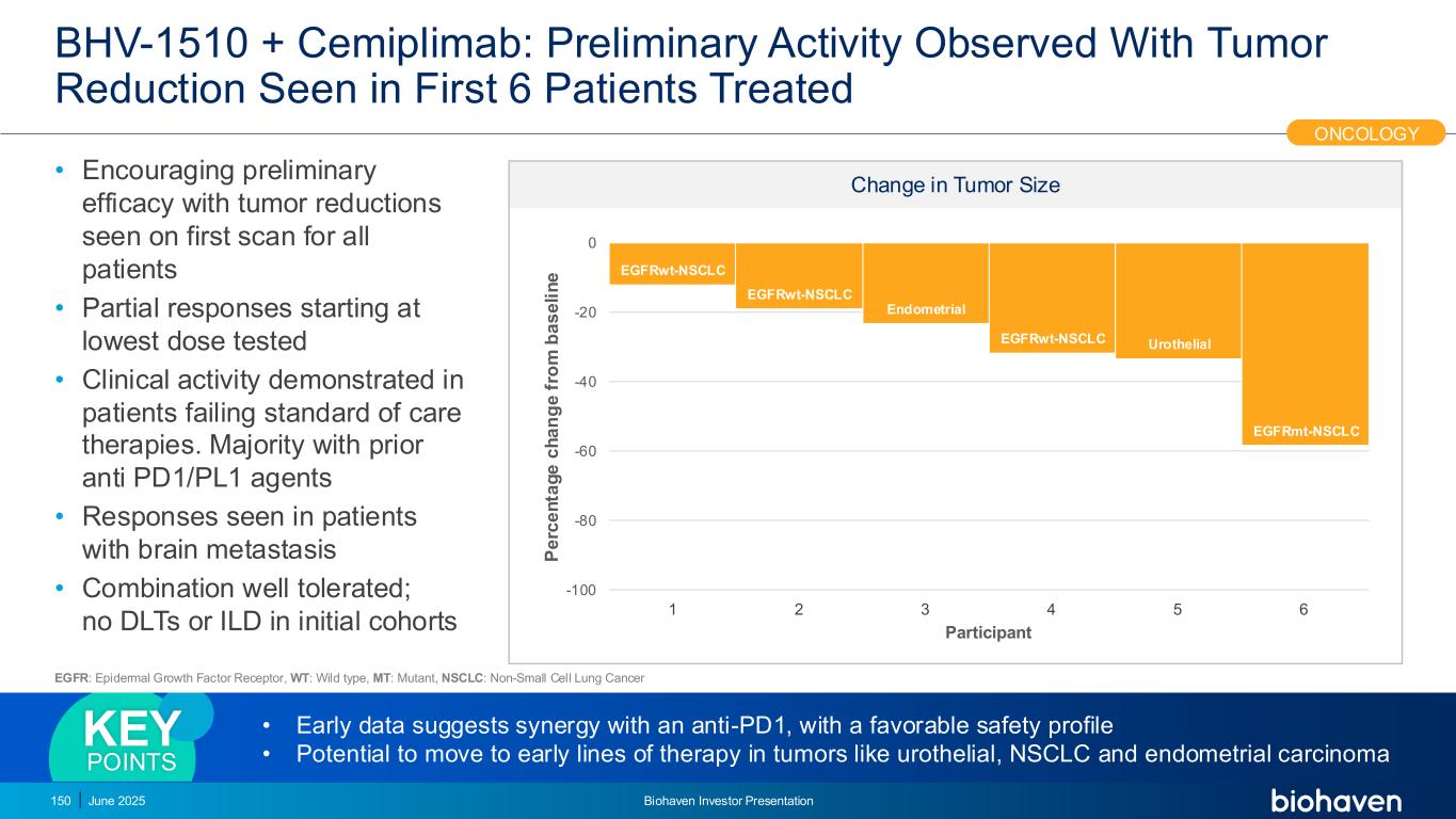 BHV-1510 + Cemiplimab肿瘤大小的变化:在前6名接受治疗的患者中观察到的肿瘤缩小的初步活性•鼓励所有患者在首次扫描中看到的肿瘤缩小的初步疗效•从测试的最低剂量开始的部分反应•在未达到标准护理疗法的患者中显示出的临床活性。大多数已有抗PD1/PL1药物•在脑转移患者中看到的反应•联合使用耐受性良好;在初始队列中没有DLTs或ILD Biohaven投资者介绍150肿瘤学EGFRWT-NSCLC EGFRWT-NSCLC子宫内膜EGFRWT-NSCLC尿路上皮EGFRMT-NSCLC-100-80-60-40-20 0 P e rc e n ta g e c h a n g e f ro m b a s e li n e EGFR:表皮生长因子受体,WT:野生型,MT:突变体,NSCLC:非小细胞肺癌•早期数据表明与抗PD1有协同作用,具有良好的安全性•有可能转向尿路上皮、NSCLC和子宫内膜癌等肿瘤的早期治疗要点2025年6月参与者123456