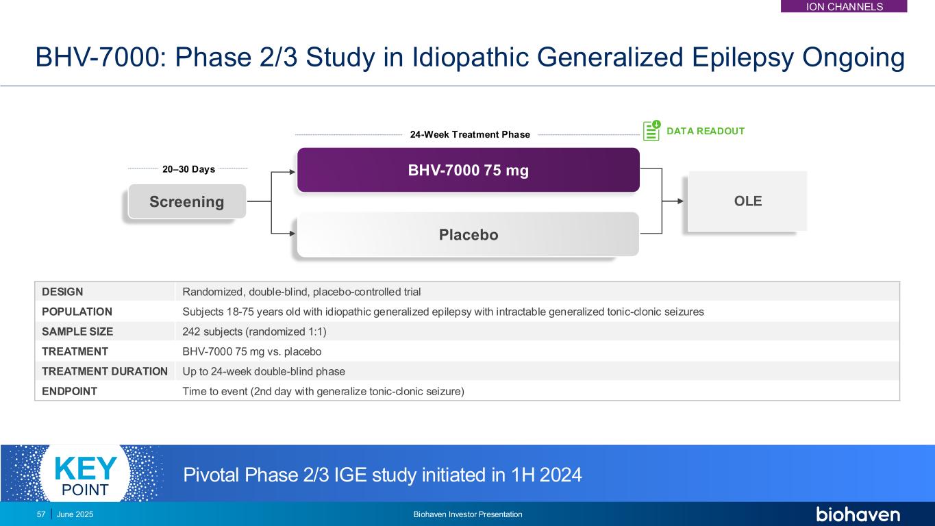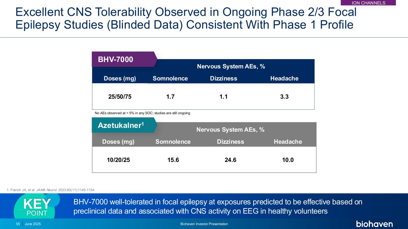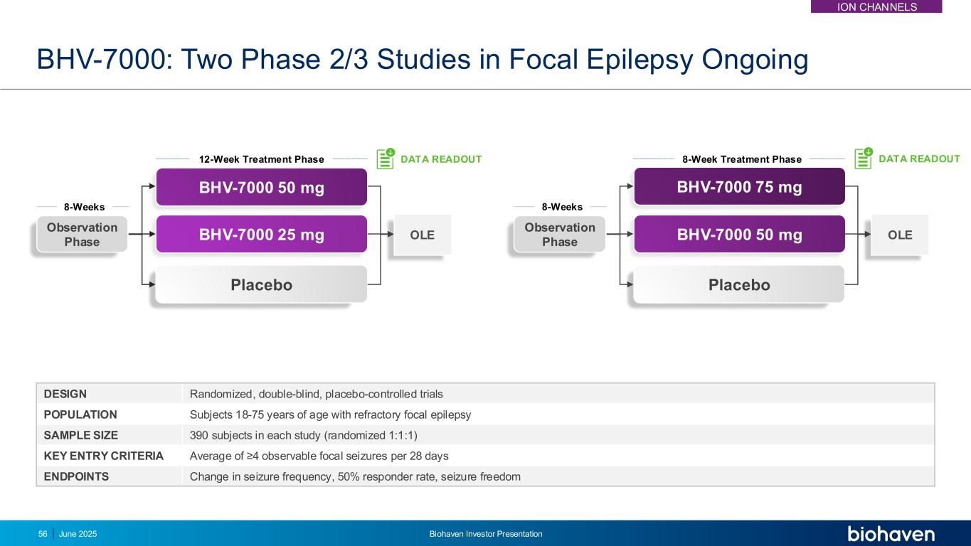 在进行中的2/3期局灶性癫痫研究(盲数据)中观察到的优异CNS耐受性与1期概况一致BHV-7000在局灶性癫痫中的耐受性良好根据临床前数据预测在暴露时有效并与健康志愿者脑电图上的CNS活性相关的关键点剂量(mg)神经系统AEs,%嗜睡头晕头痛25/50/751.7 1.1 3.3剂(mg)神经系统AEs,%嗜睡头晕头痛10/20/2515.6 24.6 10.0 Azetukalner1 BHV-7000在任何SOC中均未观察到> 5%的AEs;研究仍在进行中2025年6月55日Biohaven投资者介绍1。法国JA等JAMA Neurol。2023;80(11):1145-1154.ION渠道
