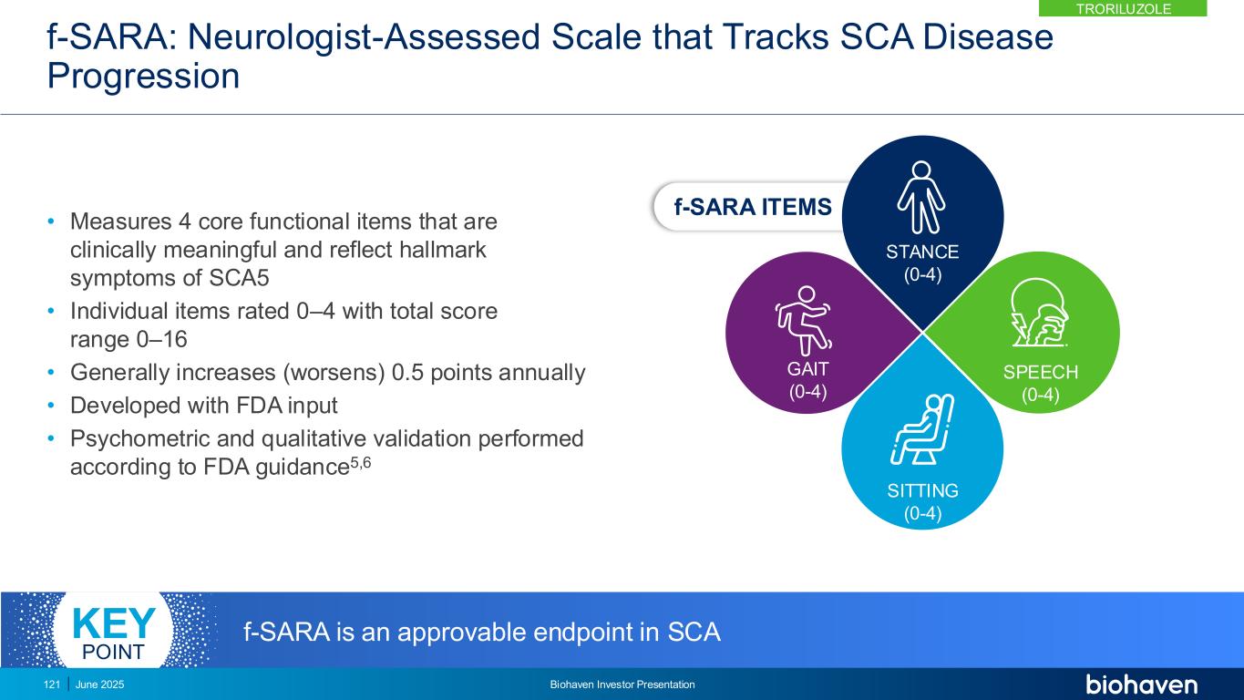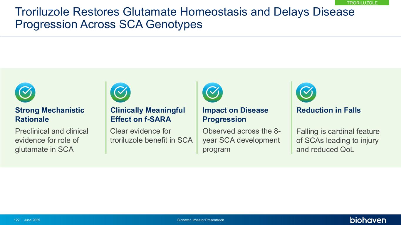 Troriluzole可恢复跨SCA基因型的谷氨酸稳态并延缓疾病进展对f-SARA具有临床意义的影响强有力的机制理性谷氨酸在SCA减少跌倒中作用的临床前和临床证据是SCA导致损伤和降低QOL对疾病进展的影响的主要特征在整个8年SCA开发计划中观察到的明确证据SCA 122中有Troriluzole获益的明确证据2025年6月Biohaven投资者介绍troriluzole