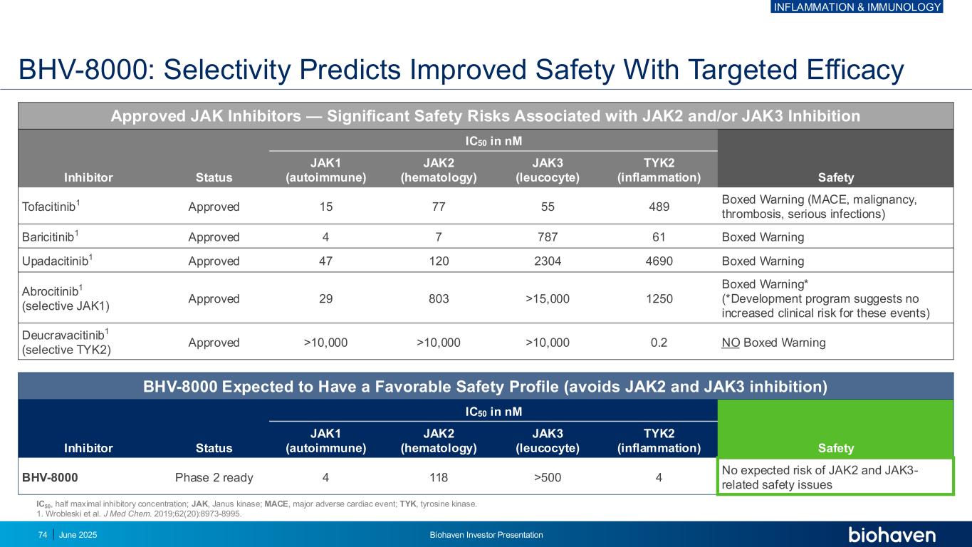 获批JAK抑制剂— NM安全性中与JAK2和/或JAK3抑制抑制剂状态IC50相关的重大安全风险JAK1(自身免疫)JAK2(血液学)JAK3(白细胞)TYK2(炎症)托法替尼1获批157755489黑框警告(MACE、恶性肿瘤、血栓形成、严重感染)巴瑞西替尼1获批4778761黑框警告Upadacitinib1获批4712023044690黑框警告Abrocitinib1(选择性JAK1)获批29803 > 15000 1250黑框警告*(*开发方案表明这些事件的临床风险没有增加)Deucravacitinib1(选择性TYK2)批准> 10,000 > 10,000 > 10,0000.2 NO黑框警告BHV-8000预计在NM安全性中具有良好的安全性(避免JAK2和JAK3抑制)抑制剂状态IC50 JAK1(自身免疫)JAK2(血液学)JAK3(白细胞)TYK2(炎症)BHV-8000 2期准备好4118 > 5004没有JAK2和JAK3相关安全问题的预期风险IC50,半最大抑制浓度;JAK、Janus激酶;MACE、重大心脏不良事件;TYK、酪氨酸激酶。1.Wrobleski et al. J Med Chem。2019;62(20):8973-8995.BHV-8000:选择性以靶向疗效预测安全性的提高炎症和免疫学2025年6月Biohaven投资者说明会74