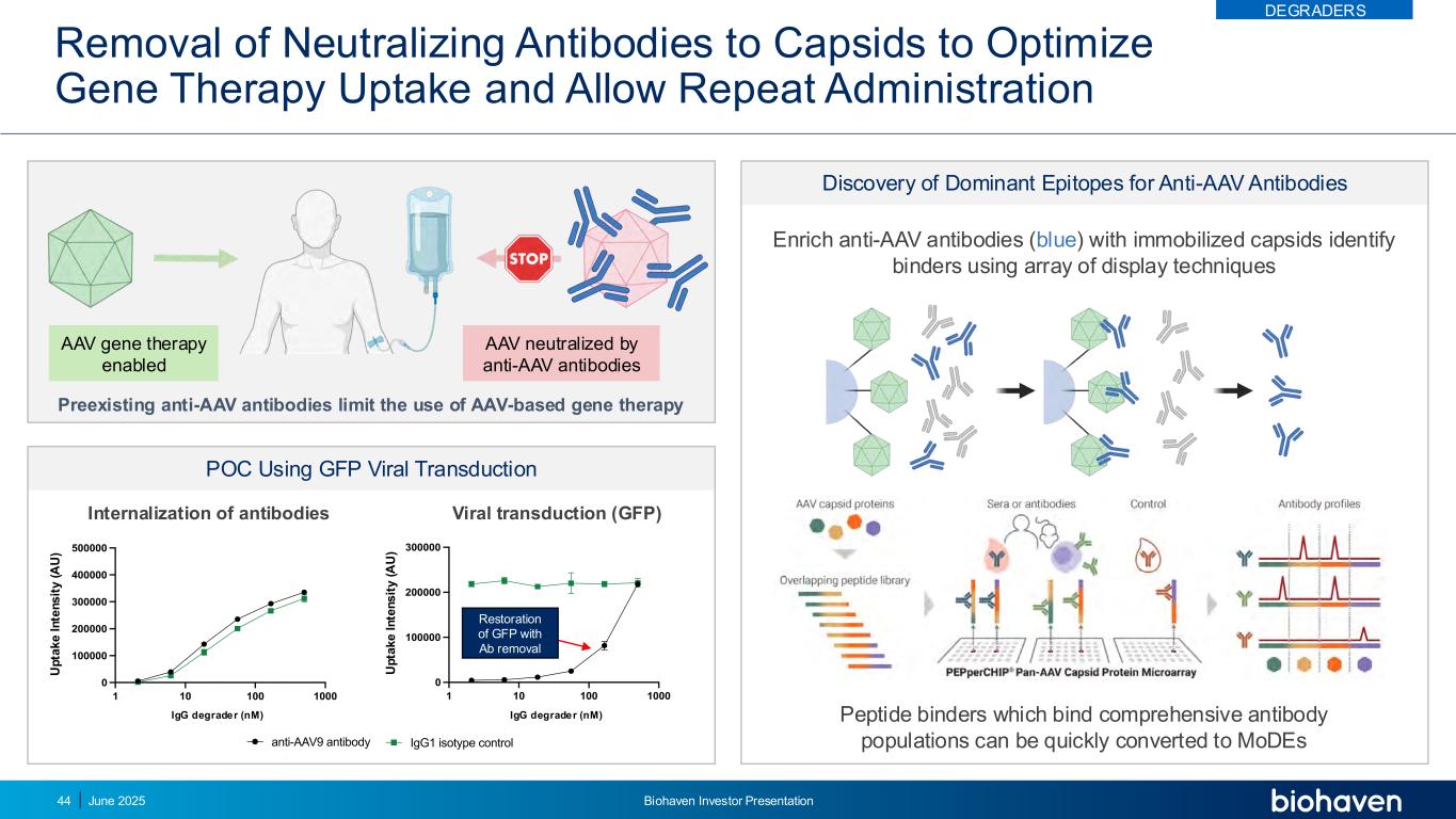 去除衣壳中和抗体优化基因治疗摄取并允许重复给药发现显性表位用于抗AAV抗体110100100000100000200000300000400000500000 BH3746 nM 647 a re a(u m 2/i m a g e)内化抗AAV9抗体IgG1同种型控制抗体内化110100100100000100000200000300000 BH3746 nM 488 a re a(u m 2/i m a g e)中和抗AAV9抗体IgG1同种型控制病毒转导(GFP)IGG降解剂(nM)IGG降解剂(nM)用去AB修复GFP用固定化衣壳鉴定粘合剂使用阵列显示技术结合综合抗体群体的肽结合剂可快速转化为MODEs先前存在的抗AAV抗体限制了基于AAV的基因疗法的使用AAV基因疗法启用了由抗AAV抗体POC使用GFP病毒转导中和的AAV 11010010010000100000200000300000400000500000 BH3746 nM 647 a re a(u m 2/i m a g e)内化抗AAV9抗体IgG1同型对照110100100100000100000200000300000400000500000 BH3746 nM 647 a re a(u m 2/i m a g e)内化抗AAV9抗体IGG1同型对照U p ta k e i n te n s it y(a u)U p ta k e i n te n s it y(a u)DEGRADERS 2025年6月Biohaven投资者介绍44