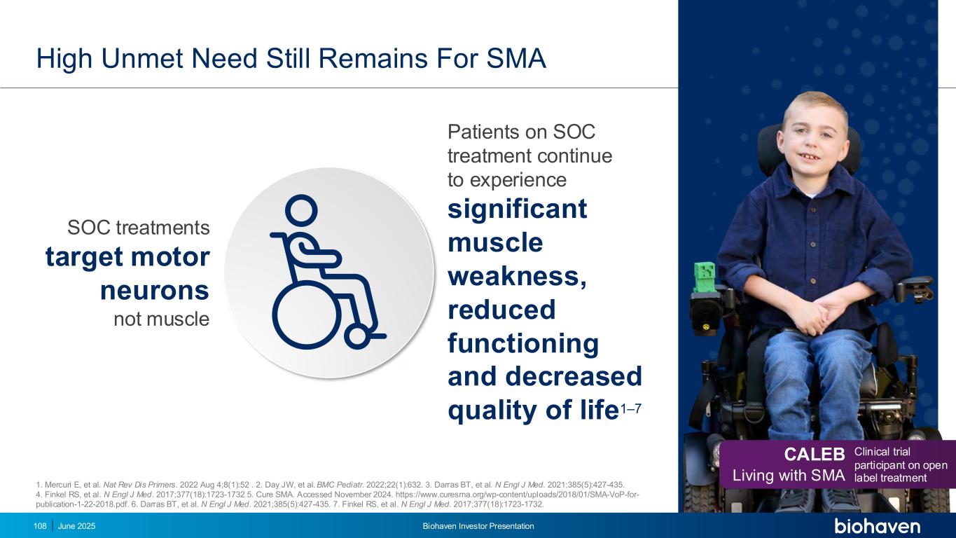 SMA 1仍存在较高的未满足需求。Mercuri E,et al. Nat Rev DIS Primers。2022年8月4日;8(1):52。2.Day JW等人BMC Pediatr。2022;22(1):632.3.Darras BT,et al. N Engl J Med. 2021;385(5):427-435。4.Finkel RS,et al. N Engl J Med. 2017;377(18):1723-1732 5。治愈SMA。2024年11月访问。https://www.curesma.org/wp-content/uploads/2018/01/SMA-VoP-for-publication-1-22-2018.pdf。6.Darras BT,et al. N Engl J Med. 2021;385(5):427-435。7.Finkel RS,et al. N Engl J Med. 2017;377(18):1723-1732。SOC治疗针对的是运动神经元而不是肌肉接受SOC治疗的患者继续经历显着的肌肉无力、功能下降和生活质量下降1 – 7 CALEB与SMA一起生活开放标签治疗的临床试验参与者2025年6月Biohaven投资者介绍108
