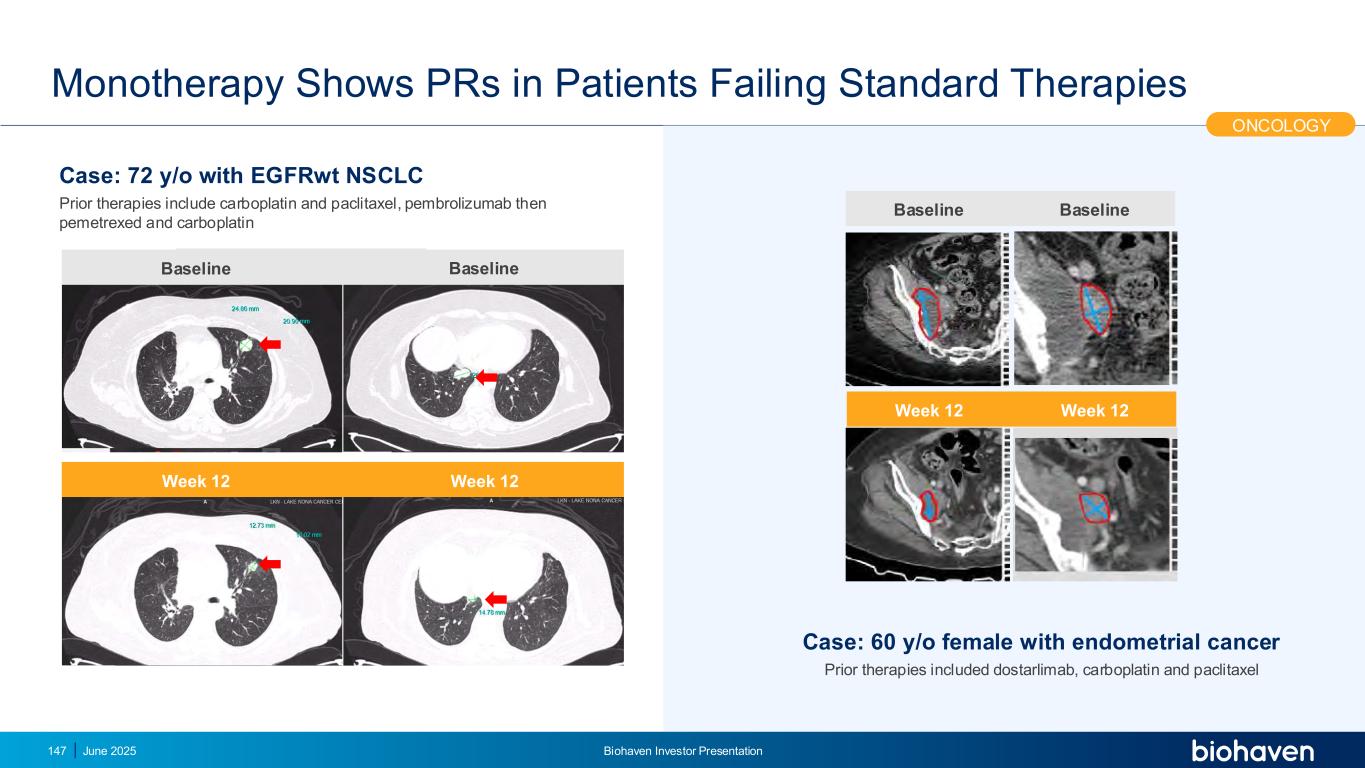 -单药疗法在未通过标准疗法的患者中显示PR 2025年6月Biohaven投资者介绍147案例:60岁女性患有子宫内膜癌先前的治疗包括dostarlimab、卡铂和紫杉醇肿瘤学案例:72岁与EGFRWT NSCLC先前的治疗包括卡铂和紫杉醇,帕博利珠单抗然后培美曲塞和卡铂第12周基线第12周基线基线基线第12周