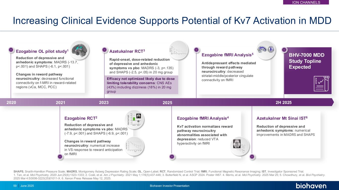 Azetukalner RCT3快速起效、剂量相关的抑郁和快感症状减轻vs PBO:MADRS(-3,p =.135)和SHAPS(-2.5,p <.05)在20mg组中的疗效可能由于剂量限制耐受性问题而没有优化:CNS AEs(43%)包括头晕(18%)在20mg组Azetukalner MT Sinai IST6减轻抑郁和快感症状:MADRS和SHAPS的数值改善增加临床证据支持MDDEzogabine RCT2中KV7激活的潜力抑郁和快感症状减轻vs PBO:MADRS(-7.9,p <.001)和SHAPS(-6.9,p <.001)奖励通路神经回路的变化:在fMRI Ezogabine OL试点研究上对奖励预期的VS反应的数值增加1抑郁和快感症状的减少:MADRS(-13.7,p <.001)和SHAPS(-6.1,p <.001)奖励通路神经回路的变化:在奖励相关区域(vCA、MCC、PCC)SHAPS、Snaith-Hamilton快感量表中f-MRI上的功能连接性降低;MADRS、Montgomery丨sberg抑郁评定量表;OL、开放标签;RCT、随机对照试验;fMRI,功能磁共振成像;IST,研究者赞助试验。1.Tan,et al. mol psychiatry。2020年6月;25日(6):1323-1333;2。Costi,et al. am J Psychiatry。2021年5月1日;178(5):437-446;3。毕达菲尔特银行 N,et al. ASCP 2024。海报W67。4.Morris,et al. Mol Psychiatry。2025年3月25日;5。Chowdhury,et al. Biol Psychiatry。2025年3月4日:S0006-3223(25)01011-X. 6。Xenon新闻稿2025年5月12日。BHV-7000 MDD研究顶线预期Ezogabine fMRI分析4 KV7激活使与抑郁症相关的奖励通路神经回路异常正常化:通过奖励通路神经回路介导的VTA过度活跃减少5抗抑郁作用:fMRI上的纹状体-中/后扣带连接性降低2020202120232025 2H202559 June 2025 Biohaven投资者介绍ION CHANNELS