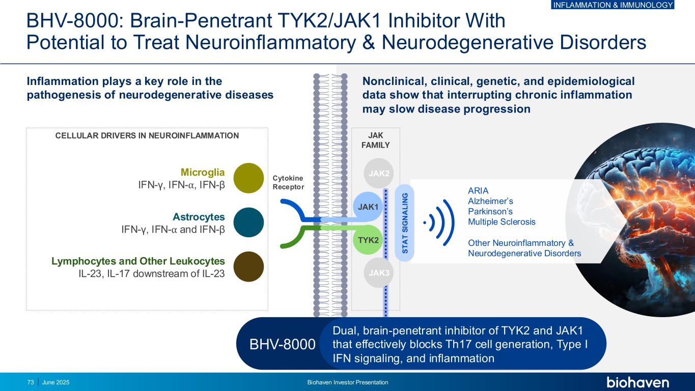 BHV-8000:具有治疗神经炎症和神经退行性疾病潜力的透脑型TYK2/JAK1抑制剂细胞因子受体JAK家族小胶质细胞IFN-γ、IFN-β、IFN-β星形胶质细胞IFN-γ、IFN-β和IFN-β淋巴细胞等白细胞IL-23、IL-17在神经炎症IL-23细胞驱动器下游的作用,在神经退行性疾病的发病机制中起关键作用非临床、遗传、流行病学数据表明,阻断慢性炎症可能减缓疾病进展ARIA阿尔茨海默氏症帕金森多发性硬化症其他神经炎症和神经退行性有效阻断Th17细胞生成、I型IFN信号传导、炎症炎症&免疫学的TYK2和JAK1的脑渗透抑制剂2025年6月Biohaven投资者宣讲73