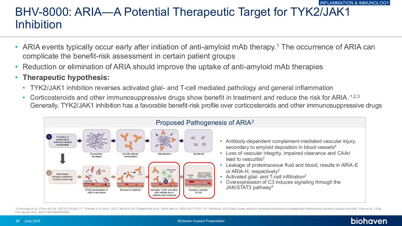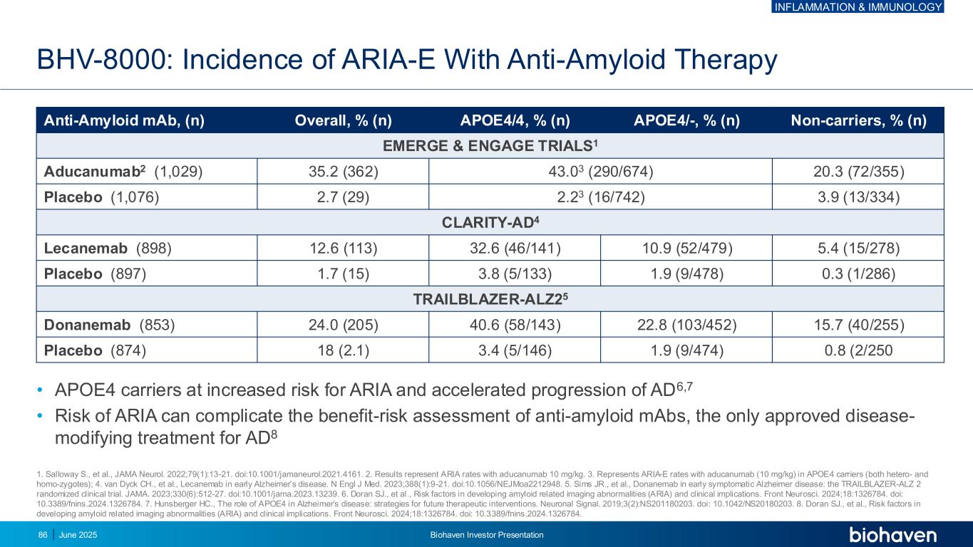 • ARIA风险增加和AD6,7进展加快的APOE4携带者• ARIA风险可使抗淀粉样蛋白单抗的利益-风险评估复杂化,这是AD8 BHV-8000唯一获批的改善疾病的治疗方法:ARIA-E与抗淀粉样蛋白疗法抗淀粉样蛋白单抗的发病率,(n)总体,%(n)APOE4/4,%(n)APOE4/-,%(n)非携带者,%(n)EMERGE & ENGAGE TRIALS1 Aducanumab2(1,029)35.2(362)43.03(290/674)20.3(72/355)安慰剂(1,076)2.7(29)2.23(16/742)3.9(13/334)CLARITY-AD4 Lecanemab(898)12.6(113)32.6(46/141)10.9(52/479)5.4(15/278)安慰剂(897)1.7(15)3.8(5/133)1.9(9/478)0.3(1/286)TRAILBLAZER-ALZ25 Donanemab(853)24.0(205)40.6(58/143)22.8(103/452)15.7(40Salloway S.,et al.,JAMA Neurol。2022;79(1):13-21。doi:10.1001/jamaneurol.2021.4161。2.结果代表aducanumab 10mg/kg的ARIA率。3.代表APOE4携带者(包括杂合子和纯合子)中与aducanumab(10mg/kg)的ARIA-E率;4. van Dyck CH.等人,Lecanemab在早期阿尔茨海默病中。N Engl J Med. 2023;388(1):9-21。doi:10.1056/NEJMoa2212948。5.Sims JR.,et al.,Donanemab in early symptomatic Alzheimer disease:the TRAILBLAZER-ALZ2 randomized clinical trial。JAMA。2023;330(6):512-27。doi:10.1001/jama.2023.13239。6.Doran SJ等,发生淀粉样蛋白相关成像异常(ARIA)的风险因素和临床意义。前神经科学。2024;18:1326784.doi:10.3389/fnins.2024.13 26784。7.Hunsberger HC.,APOE4在阿尔茨海默病中的作用:未来治疗干预的策略。神经元信号。2019;3(2):NS201180203。doi:10.1042/NS20180203。8.Doran SJ,et al.,developing amyloid related imaging abnormality(ARIA)的危险因素和临床意义。前神经科学。2024;18:1326784.doi:10.3389/fnins.2024.13 26784。炎症与免疫学2025年6月Biohaven投资者说明会86