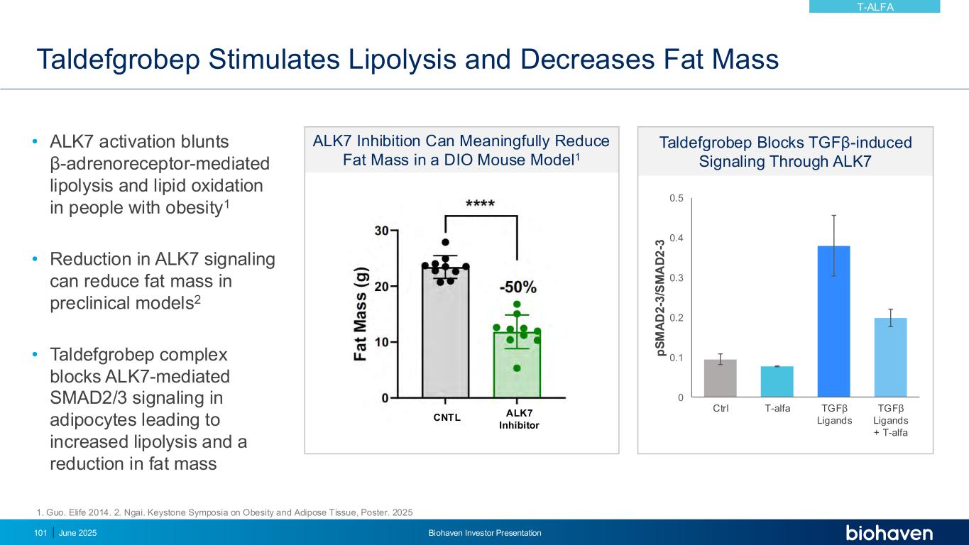 ALK7抑制可显着减少DIO小鼠模型中的脂肪质量1 taldefgrobep刺激脂肪分解并减少脂肪质量2025年6月Biohaven投资者介绍101 • ALK7激活减弱肥胖人群中β-肾上腺素受体介导的脂肪分解和脂质氧化作用1 • ALK7信号传导的减少可减少临床前模型中的脂肪质量2 • taldefgrobep复合物阻断ALK7介导的脂肪细胞SMAD2/3信号传导,导致脂肪分解增加和脂肪量减少ALK7抑制剂CNTL 1。郭。Elife 2014。2.Ngai. Ngai. Ngai. Ngai. Ngai. Ngai. Ngai. Ngai. Ngai. Ngai. Ngai. Ngai. Ngai. NKeystone Symposia on Obesity and Adiose Tissue,海报。2025 taldefgrobep通过ALK7阻断TGF β诱导的信号传导00.10.2 0.3 0.4 0.5 1234 p S M A D2-3/S M A D2-3 CTRL T-alfa TGF β配体TGF β配体+ T-alfa T-ALFA
