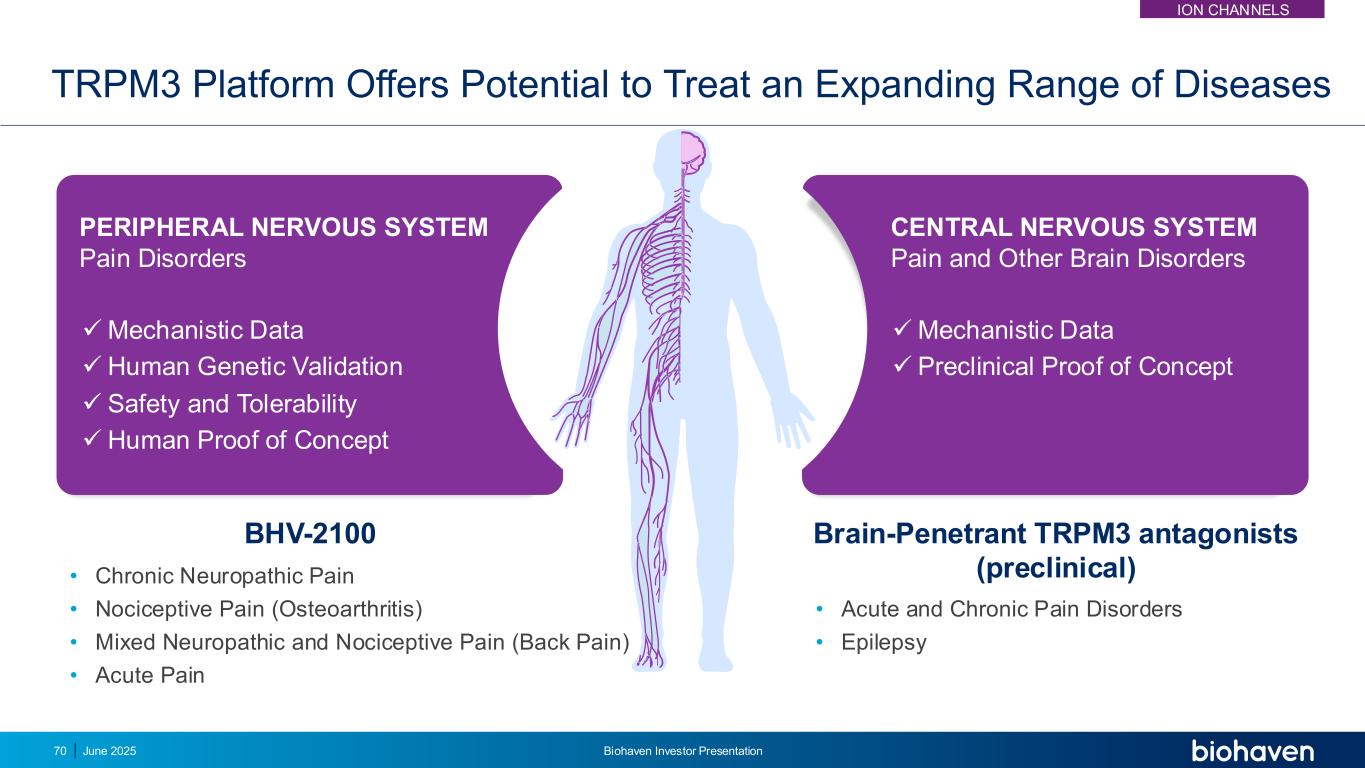 BHV-2100 TRPM3平台提供了治疗范围不断扩大的疾病的潜力•慢性神经性疼痛•伤害性疼痛(骨关节炎)•神经性和伤害性混合疼痛(背痛)•急性疼痛丨机制数据丨人类基因验证丨安全性和耐受性丨人为证明概念外周神经系统疼痛障碍中枢神经系统疼痛和其他脑疾病丨机制数据丨概念透脑性TRPM3拮抗剂的临床前证明(临床前)•急、慢性疼痛障碍•癫痫2025年6月Biohaven投资者宣讲会70 ION CHANNELS