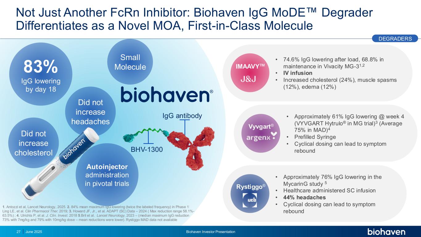 •负荷后IGG降低74.6%,Vivacity MG-31,2中维持68.8% • IV输注•胆固醇升高(24%)、肌肉痉挛(12%)、水肿(12%)•第4周IGG降低约61%(VYVGART HYtrulo®在MG试验中)3(MAD中平均75%)4 •预充式注射器•周期性给药可导致症状反弹,而不仅仅是Just Another FCRN抑制剂:Biohaven IGG ModE降解剂可作为一种新型MOA进行分化,一流分子IGG抗体BHV-1300 •在MycarinG研究中降低约76%的IGG 5 •医疗保健给药SC输注• 44%的头痛•周期性给药可导致症状反弹83%到第18天降低IGG没有增加胆固醇没有增加头痛关键试验中的自动注射器给药Vyvgart®IMAAVY Rystiggo®降级器27小分子1。Antozzi等人,Lancet Neurology,2025。2.84%的平均1期最大IGG降低(标记频率的两倍):Ling LE,et al. Clin Pharmacol Ther。2019; 3.Howard JF,Jr.,et al. ADAPT(SC)data – 2024(Max reduction range 58.1%-63.5 %);4。Ulrichts P,et al. J. Clin。投资。2018年5.bril等人Lancet Neurology,2023 –(7mg/kg时中位最大IGG减少73%,10mg/kg剂量时减少79% –平均减少更低)。Rystiggo MAD数据不可得2025年6月Biohaven投资者介绍