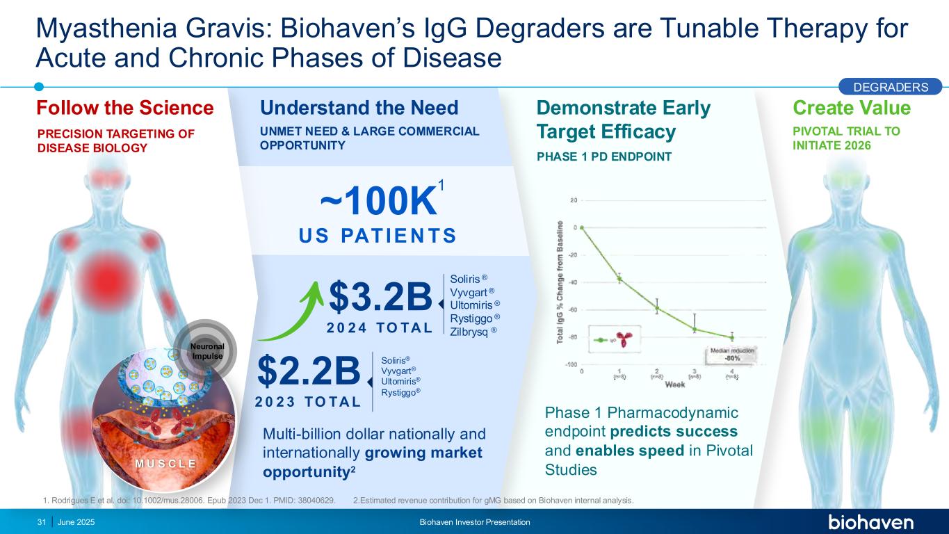 创造价值关键试验以启动2026年重症肌无力:Biohaven的IGG降解剂是用于疾病急慢性阶段的可调理疗法1期药效学终点预测成功,并在关键研究中实现全国数十亿美元的速度和国际增长的市场机会2~100K US PATIE N TS $ 3.2B 2024 to TA L Soliris®Vyvgart®Ultomiris®Rystiggo®Zilbrysq®$ 2.2B 2023转TA L Soliris®Vyvgart®Ultomiris®Rystiggo®了解需求UNMET needs & large commercial opportunity demonstrates early target efficacy phase 1 PD endpoint neuronal impulse M US C L E follow the science precision targeting of disease biology degraders June 2025。Rodrigues E等doi:10.1002/mus.28006。Epub 2023年12月1日。PMID:38040629。2.基于Biohaven内部分析对GMG的收入贡献进行测算。1场Biohaven投资者说明会31