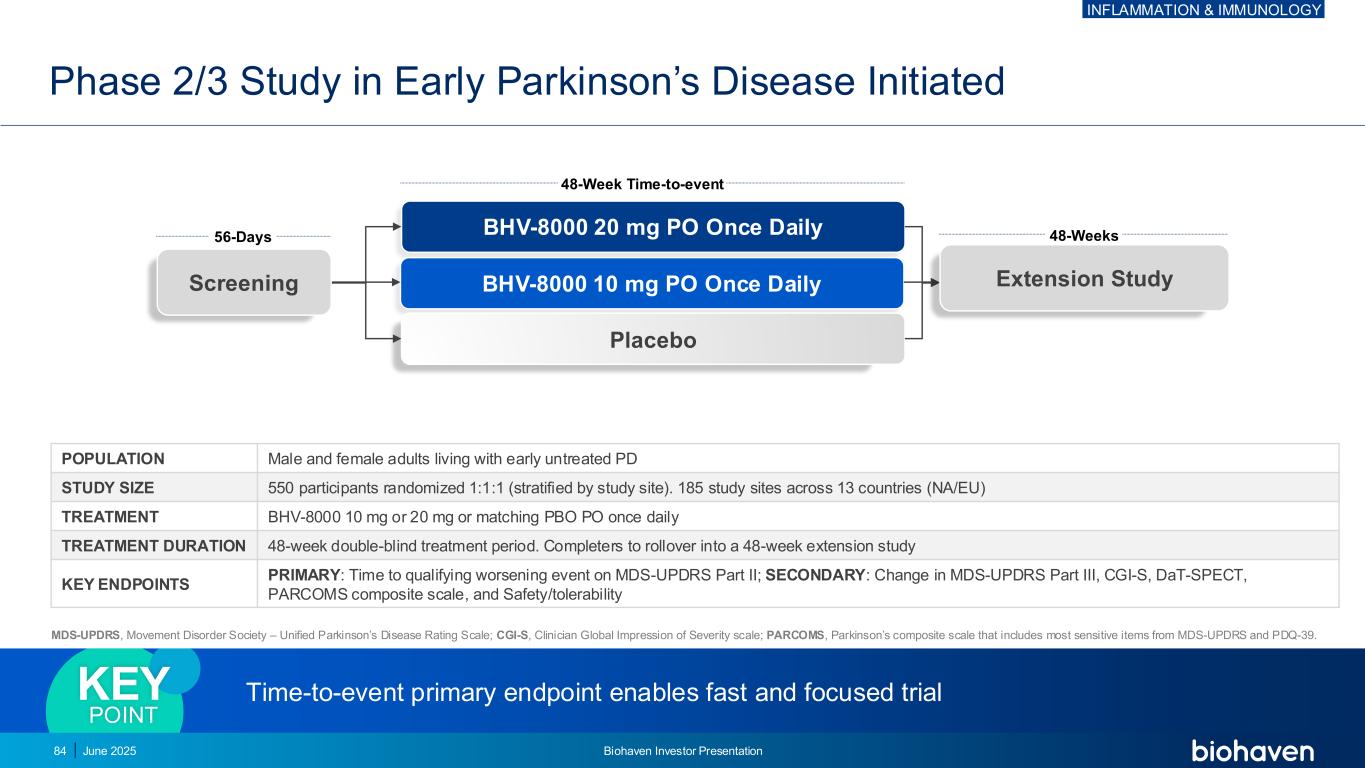 MDS-UPDRS,Movement Disorder Society – Unified Parkinson’s Disease Rating Scale;CGI-S,Clinician Global Impression of Severity Scale;PARCOMS,Parkinson’s Composite Scale,其中包括MDS-UPDRS和PDQ-39中最敏感的项目。48周事件发生时间BHV-8000 20毫克PO每日一次BHV-8000 10毫克PO每日一次安慰剂56天48周筛查人群男性和女性成人早期未经治疗的PD研究规模550名参与者随机1:1:1(按研究地点分层)。13个国家(NA/EU)的185个研究地点治疗BHV-8000 10毫克或20毫克或匹配的PBO PO每日一次治疗持续时间48周双盲治疗期。完成者转入为期48周的延长研究关键终点主要:MDS-UPDRS第II部分的定性恶化事件的时间;第二部分:MDS-UPDRS第III部分、CGI-S、DAT-SPECT、PARCOMS复合量表和安全性/耐受性延长研究的变化早期帕金森病启动的事件发生时间主要终点的2/3期研究可实现快速和集中的试验关键点2025年6月84号Biohaven投资者介绍炎症和免疫学