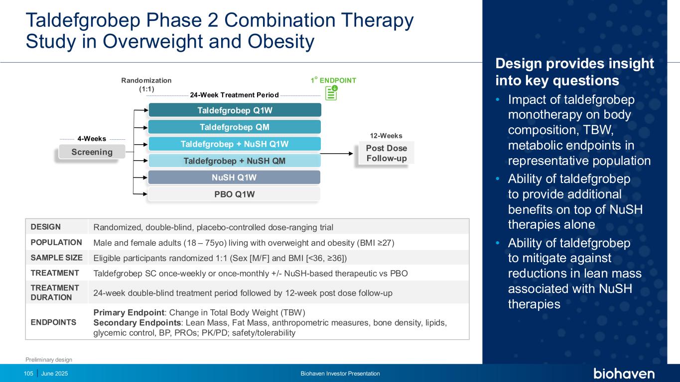 Design提供对关键问题的洞察• taldefgrobep单药治疗对代表性人群身体成分、TBW、代谢终点的影响• taldefgrobep在单独使用NUSH疗法的基础上提供额外益处的Ability • taldefgrobep缓解与NUSH疗法相关的瘦体重减少的Ability 2025年6月Biohaven投资者介绍105 taldefgrobep 2期联合治疗研究在超重和肥胖设计中的随机、双盲、安慰剂对照剂量范围试验人群中的男性和女性成年人(18 – 75岁)超重和肥胖(BMI ≥ 27)样本大小符合条件的参与者按1:1(性别[ M/F ]和BMI≥ 36 ])治疗taldefgrobep SC每周一次或每月一次+/-基于NUSH的治疗vs PBO治疗持续时间24周双盲治疗期随后是12周的剂量后随访终点主要终点:总体重(TBW)的变化次要终点:瘦肉量、脂肪量、人体测量、骨密度、脂质、血糖控制、BP、PRO;PK/PD;安全性/耐受性12周4周24周治疗期筛查随机(1:1)剂量后随访taldefgrobep + NuSH Q1W NuSH Q1W 1终点taldefgrobep + NuSH QM taldefgrobep QM taldefgrobep Q1W PBO Q1