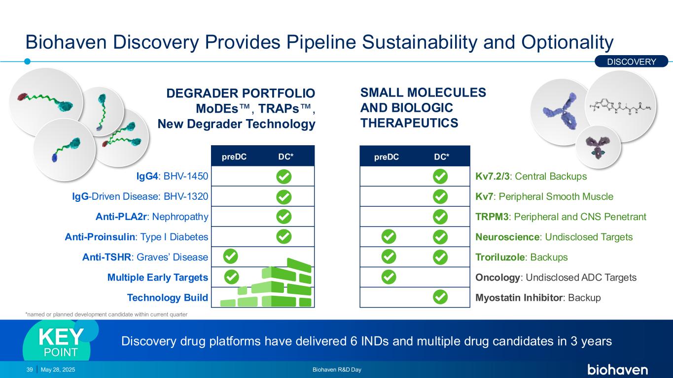 preDC直流*IGG4:BHV-1450 IGG驱动疾病:BHV-1320抗PLA2r:肾病抗胰岛素原:I型糖尿病抗TSHR:Graves病多个早期靶点技术构建的Biohaven发现提供了管道的可持续性和可选性2025年5月28日Biohaven研发Day39 DEGRADER组合模式、TRAP、新型降解器技术小分子和生物疗法*DC被命名或预计在本季度发现药物平台在3年内交付了6个IND和多个候选药物KEY POINT preDC*KV7.2/3:中央备份KV7:外周平滑肌TRPM3:外周和CNS渗透神经科学:未公开靶点曲瑞鲁唑:备份肿瘤学:未公开ADC靶点Myostatin抑制剂:备份发现*在当前季度内指定或计划开发候选人