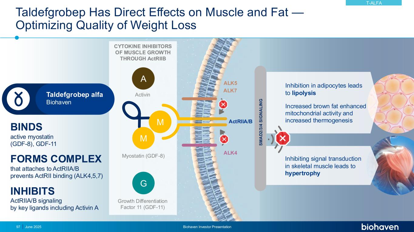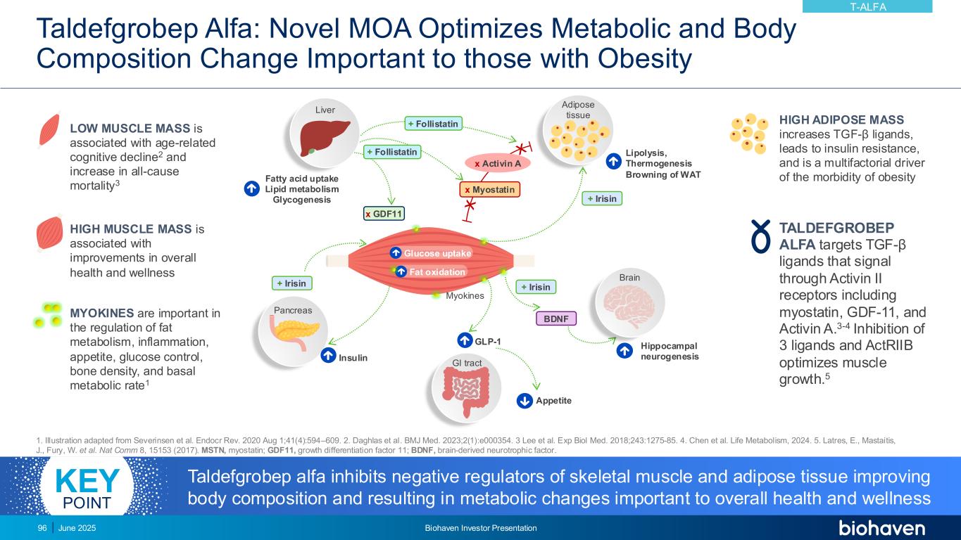 Taldefgrobep Alfa:新型MOA优化代谢和身体成分变化对肥胖者很重要1。插图改编自Severinsen等人,Endocr Rev. 2020 Aug 1;41(4):594 – 609。2.Daghlas et al. BMJ Med. 2023;2(1):e000354。3 Lee et al. exp biol med. 2018;243:1275-85。4.Chen et al. Life Metabolism,2024。5.Latres,E.,Mastaitis,J.,Fury,W. et al. Nat Comm 8,15153(2017)。MSTN,myostatin;GDF11,生长分化因子11;BDNF,脑源性神经营养因子。脂肪分解、WAT食欲GLP-1脂肪酸摄取的生热褐变脂质代谢糖生成胰岛素葡萄糖摄取脂肪氧化脑肌动蛋白胃肠道+ Irisin + Irisin BDNF胰肝x GDF11脂肪组织+ Irisin x Myostatin x Activin A + Follistatin海马神经发生+ Follistatin LOW MUSCLE MASS与年龄相关性认知能力下降2和全因死亡率增加有关3高肌肉MASS与整体健康和保健的改善有关MYOKINES在调节脂肪代谢、炎症、食欲、葡萄糖控制、骨密度和基础代谢率方面具有重要意义1高脂肪代谢MS导致胰岛素抵抗,是肥胖症发病率的多因素驱动因素TALDEFGROBEP ALFA靶向TGF-β配体,这些配体通过包括肌肉抑制素、GDF-11在内的Activin II受体发出信号,Activin A.3-4抑制3个配体和ActRIIB优化肌肉生长。5 T-ALFA 2025年6月Biohaven投资者介绍96 TALDEFGROBEP ALFA抑制骨骼肌和脂肪组织的负调节因子,改善身体成分,并导致对整体健康和健康至关重要的代谢变化关键点