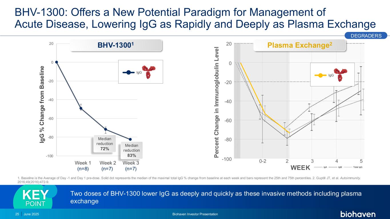 -100-80-60-40-20 020 IGG BHV-1300:为急性疾病管理提供了一种新的潜在范式,可以像Plasma Exchange一样快速和深入地降低IGG 2025年6月Biohaven投资者介绍25两种剂量的BHV-1300可以像包括血浆交换关键点1在内的这些侵入性方法一样深入和快速地降低IGG。基线是第1天和第1天接种前的平均值。实心点表示每周相对于基线的最大总IGG %变化的中位数,条表示第25和第75个百分位。2.Guptill JT等人的自身免疫。2016;49(2016):472-9.0-2 234 5-100-80-60-40-20 0 20 IGG P e rc e n t C h a n g e i n i m u n o g lo b u li n l e v e l week BHV-13001等离子体交换2降级器中位减少72%中位减少83%第1周(n = 8)第2周(n = 7)第3周(n = 7)IG G % C h a n g e f ro m B a s e li n e