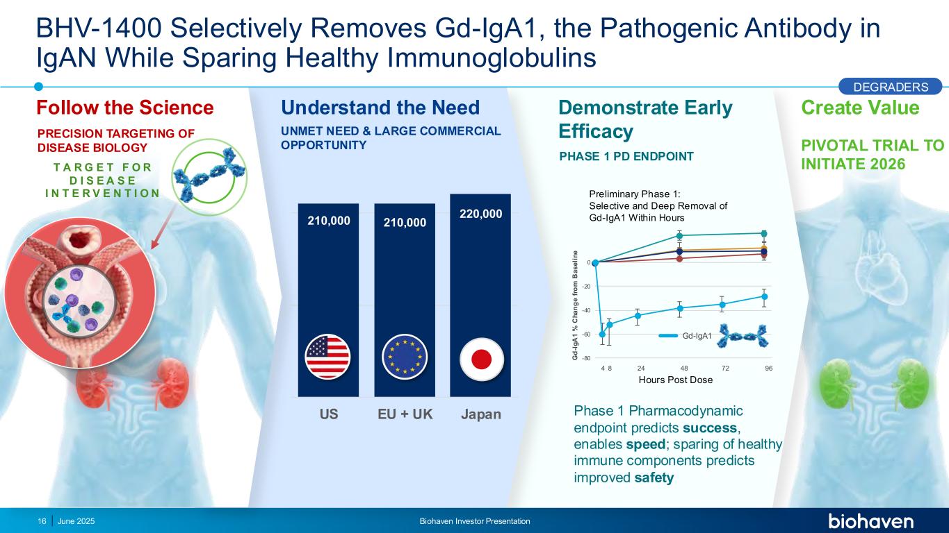 GD-IGA1免疫复合物沉积到肾脏中,募集免疫细胞并导致促炎和促纤维化介质的释放S Y S T E M I C I R C U L A T I O N异常形式的免疫球蛋白,半乳糖缺陷型IGA1在过量的免疫球蛋白(IGG,IGM或IGA)靶向GD-IGA1形成循环免疫复合物GD-IGA1 I G R E N A L C O R P U S C L E IGA肾病是由半乳糖缺乏性IGA1(GD-IGA1)过量产生引起的无疗法选择性地靶向疾病的致病性病灶,GD-IGA1..。直到NOWKEY POINT DEGRADERS F O L L O W T H E S C I E N C E 2025年6月17日Biohaven投资者说明会